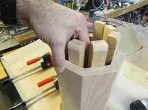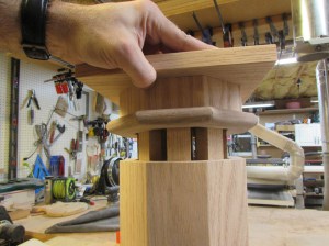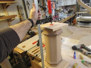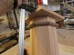 In the process of trying to determine the dimensions of the short column’s top, Msgr. Rowan and I discovered that I had made the center column too tall. He gave me the dimensions of the reliquary and standing on the column, it would have just stopped 1/4″ from the altar top. Since the column was 90% complete, I didn’t want to scrap it so I gave the problem some thought and decided to cut down the column right beneath the walnut trim. A repair at this location would be unnoticeable if done right.