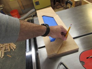 Since the board, that I screwed up, was from the same board as the current bottom piece, I decided to use it to make the plugs. I ripped the messed-up section off and took it to the drill press.