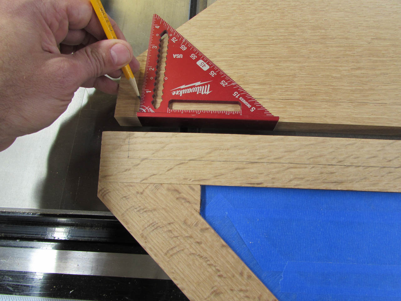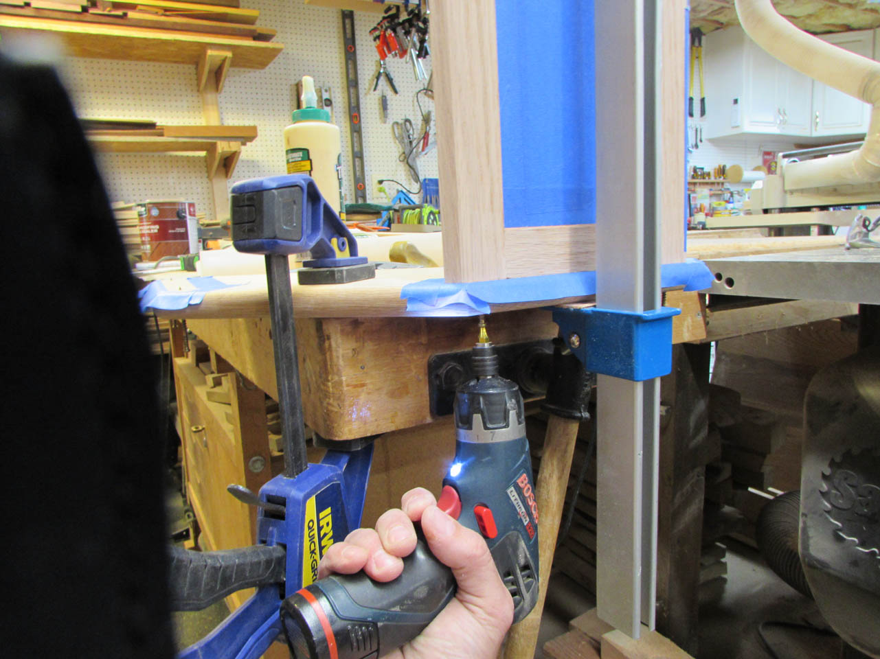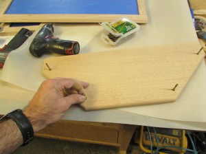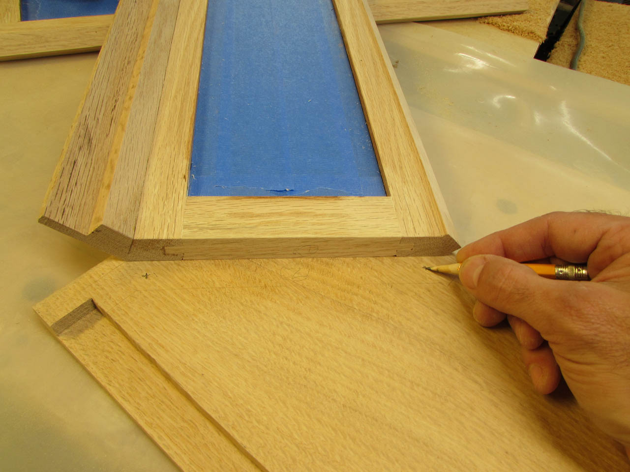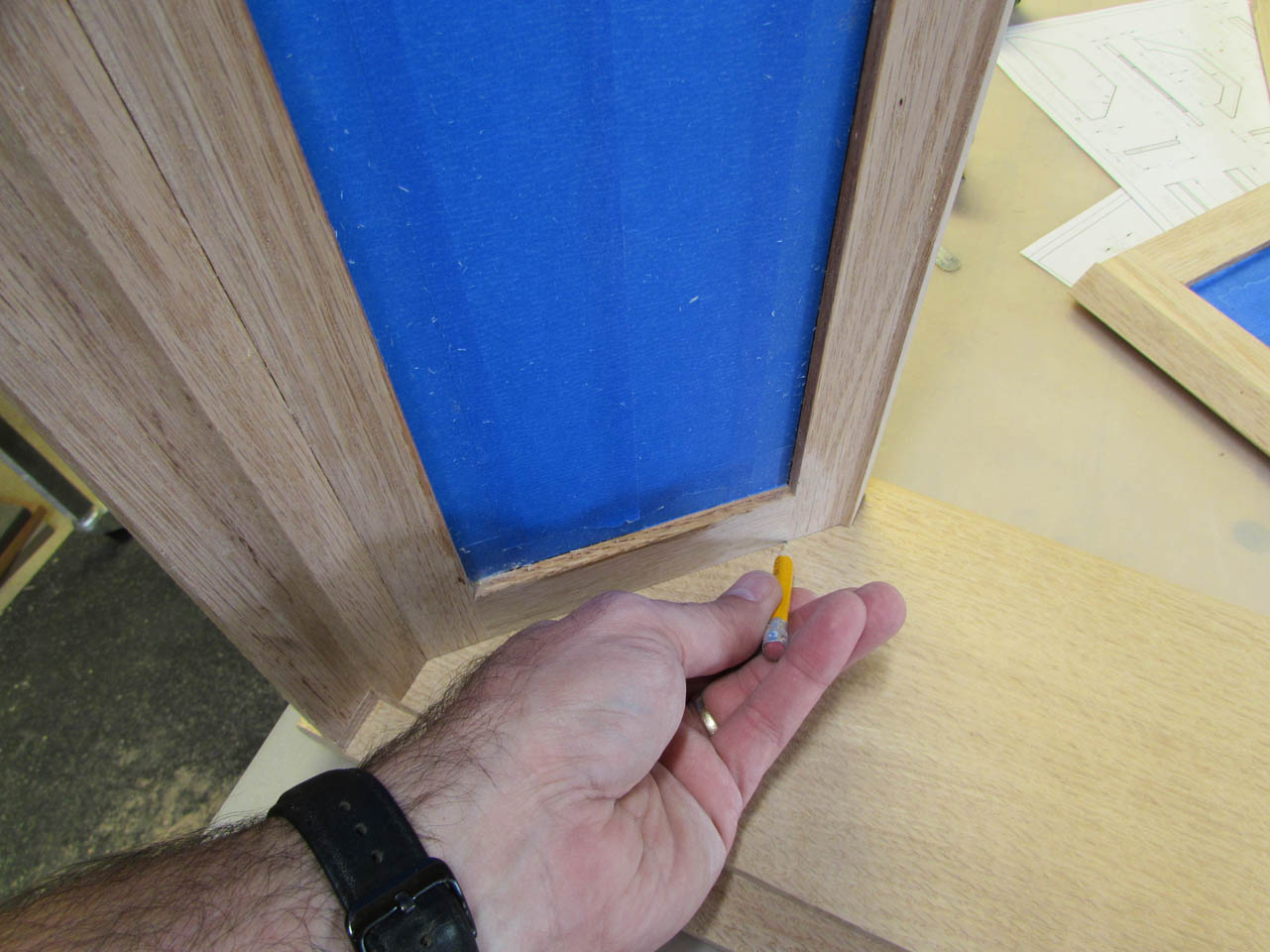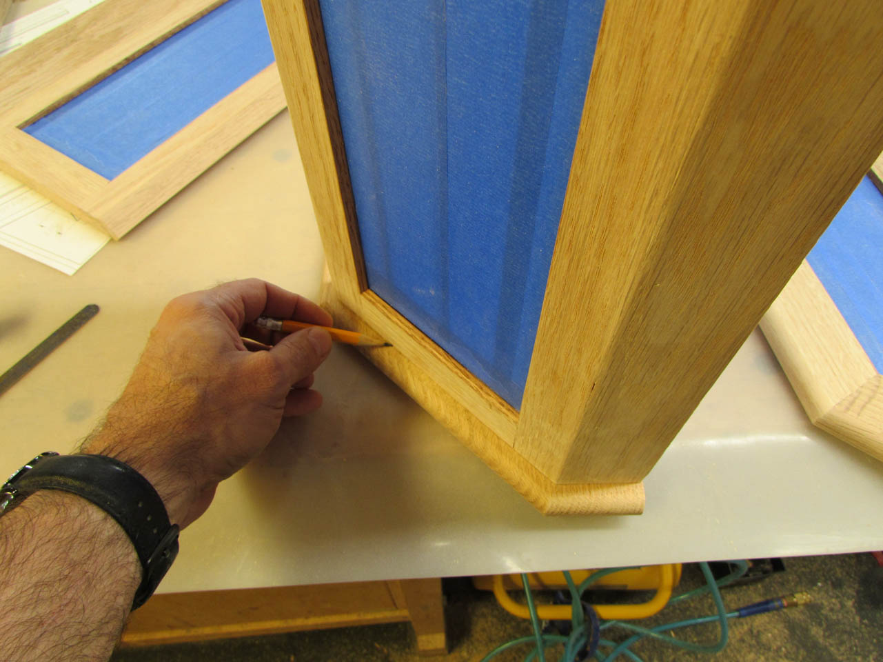 I will be gluing the top and bottom on, but I want to back it up with screws in a couple locations. I marked two holes at each panel, in a location that would not hit the glass. I am going to use trim screws then plug the holes.
