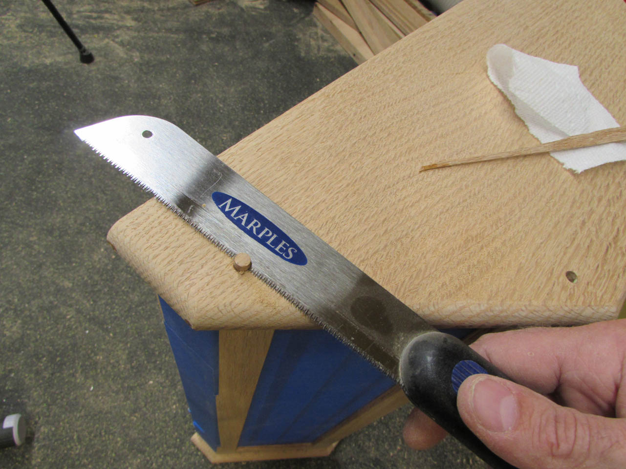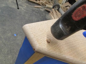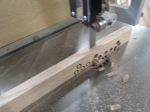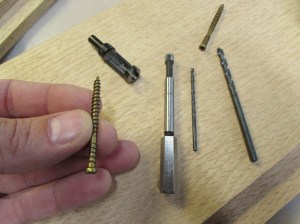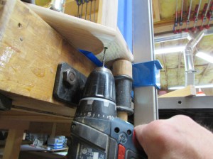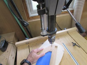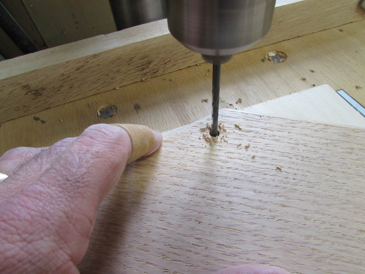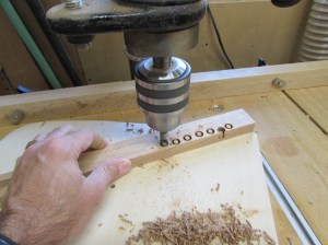 I installed a 1/4″ plug cutter and made a about a dozen plugs. I drilled 90% of the way through the board, leaving them attached.