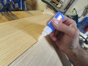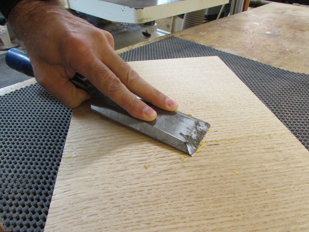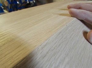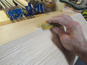 Everything sat overnight, so the glue is all dry. I pulled the clamps and started cleaning up the glue squeeze-out at the center seam of my panels.