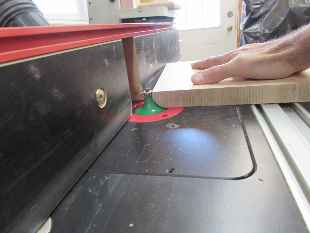 After a quick sanding, I loaded the 3/4″ round-over bit into the router table and cut a radius along the front and sides of the board.