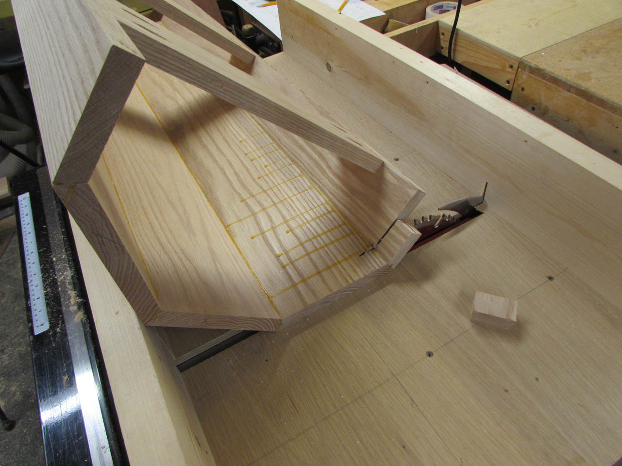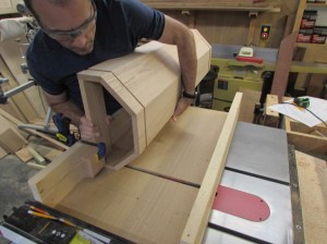 While I am making awkward cuts anyway, I went ahead and loaded my dado blade and cut the 1/8″ deep groove to receive the walnut trim.