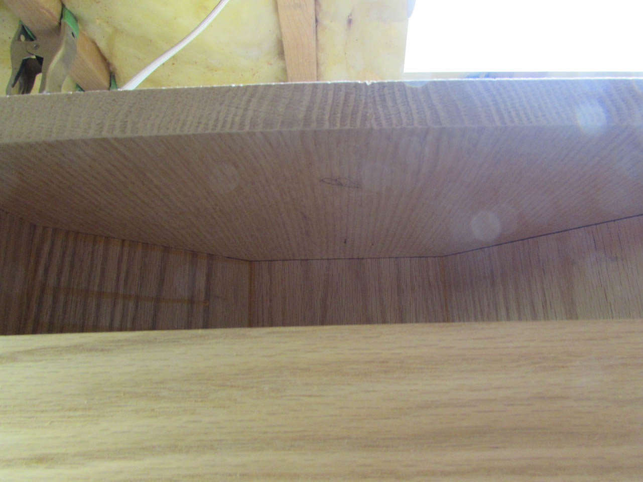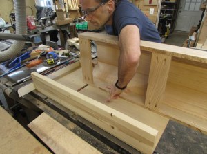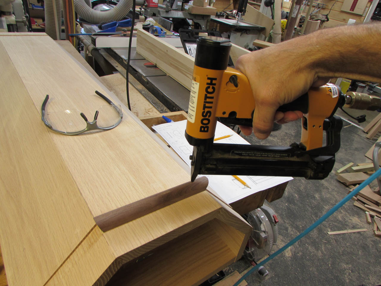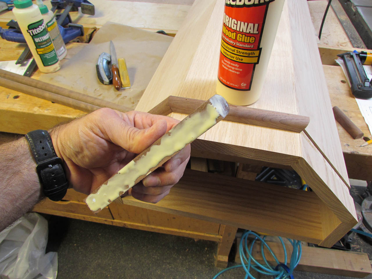 As I attach each piece of trim, I sand the joint to force sawdust into any gaps and so it will stick to the glue to fill them.