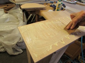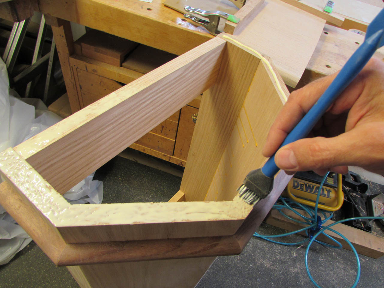 Time for final assembly. I still have my light pencil marks on the base cap so I clamped two strips along them, then I spread glue along the bottom end of the column.