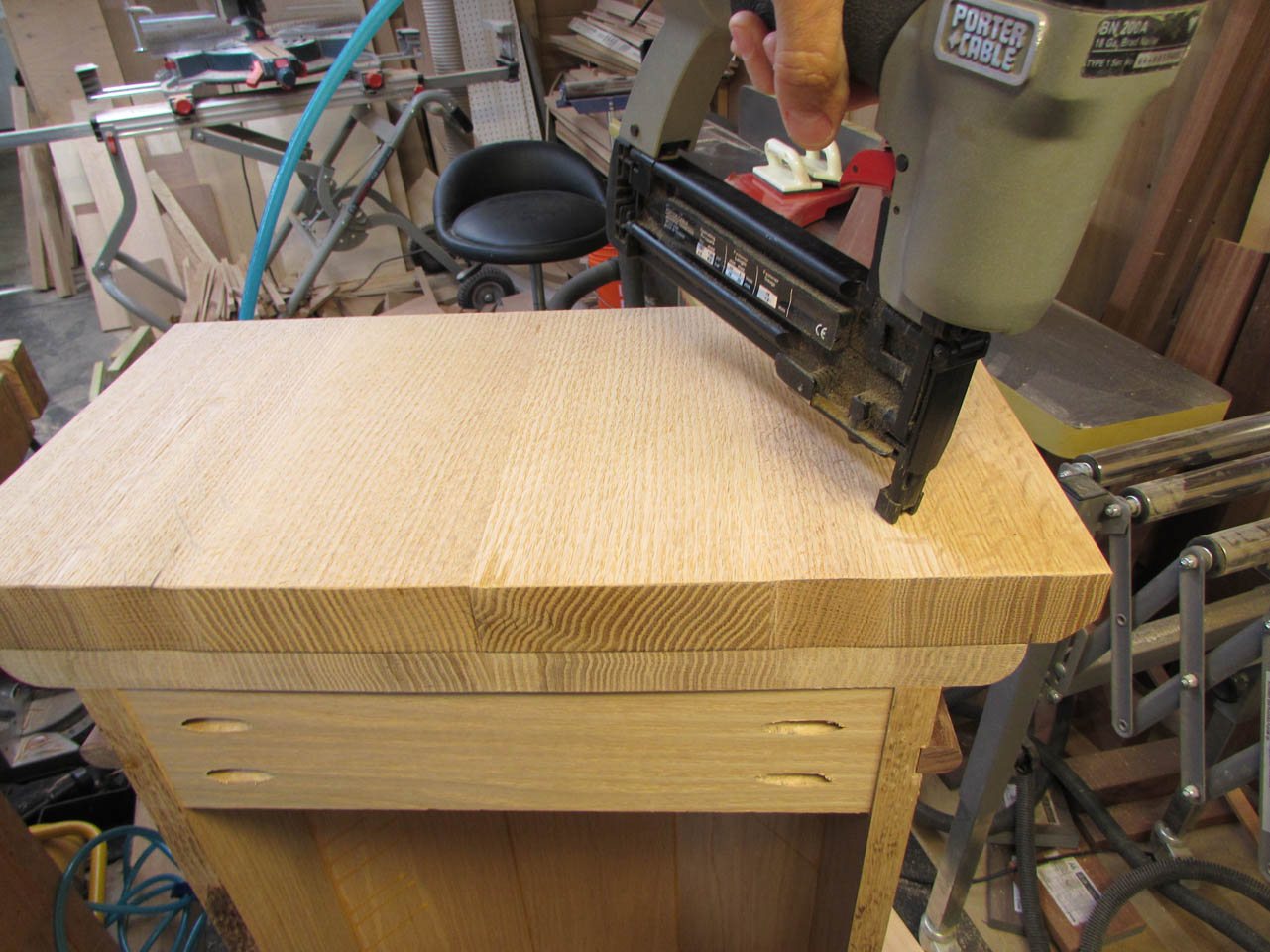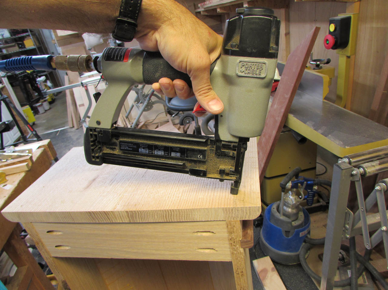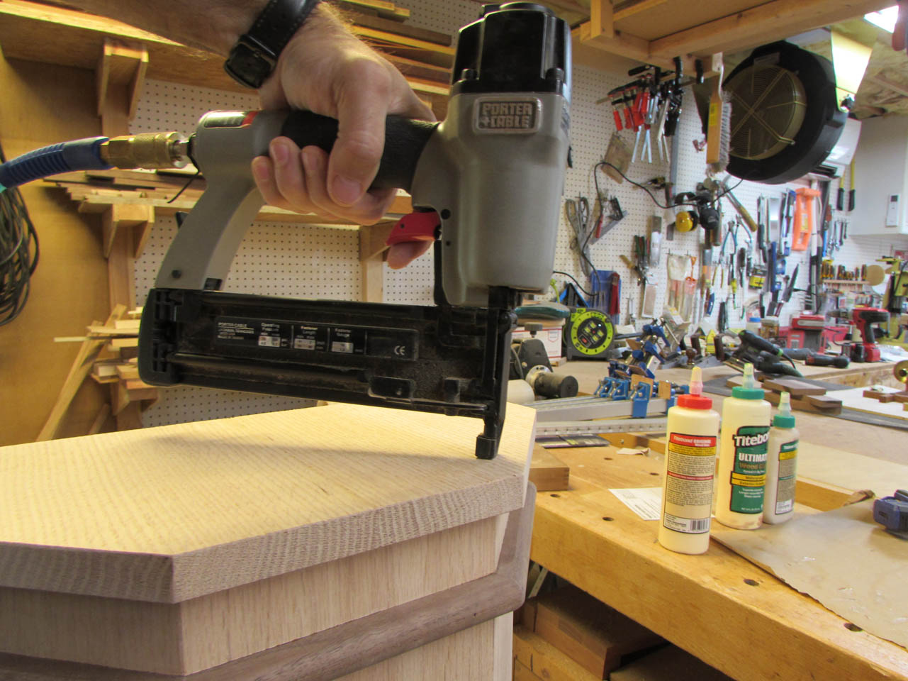 Next I drove 2″ long brad nails through the plate into the column at a slightly inward facing angle so none of the nails shot through the face.