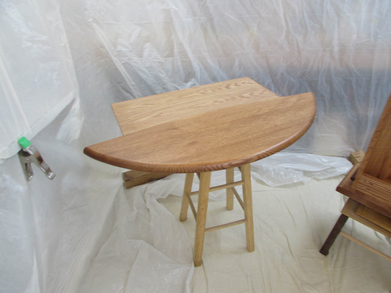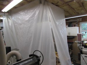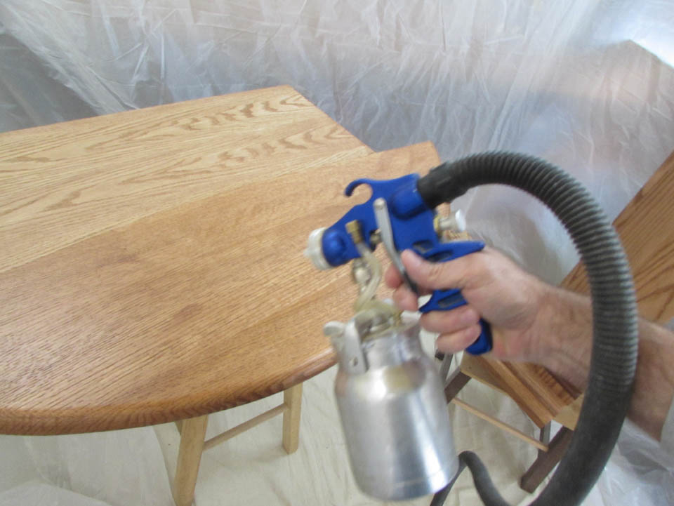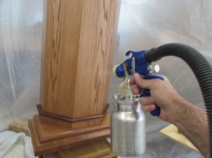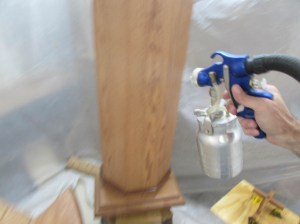 I apply the first coat of polyurethane with my Earlex 5500 HVLP sprayer. Funny, It takes about an hour to clean this half of my shop and set up the spray booth, but it only takes five minutes to spray everything.