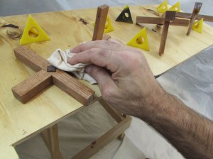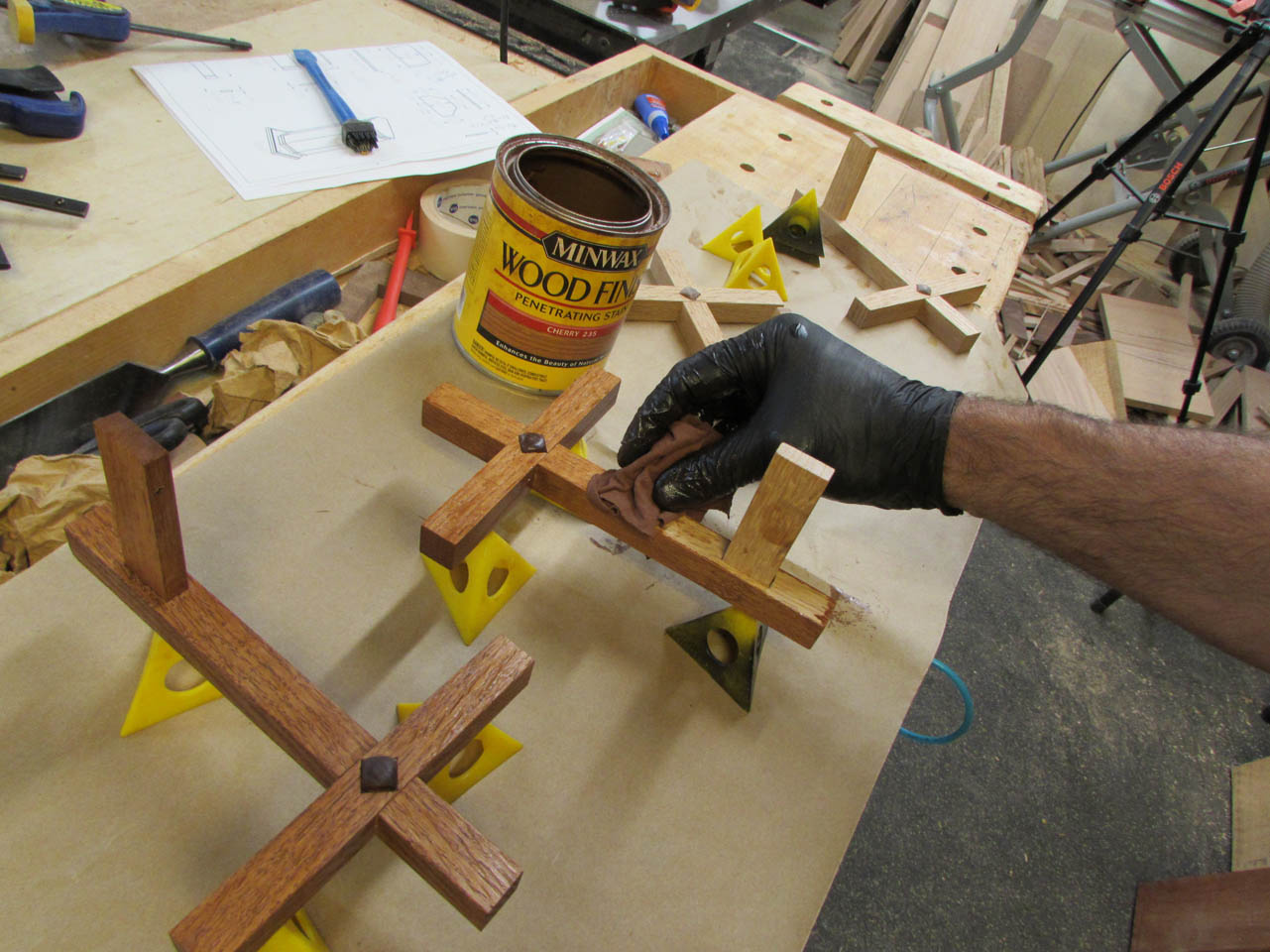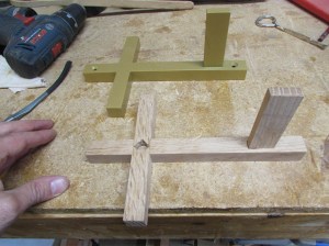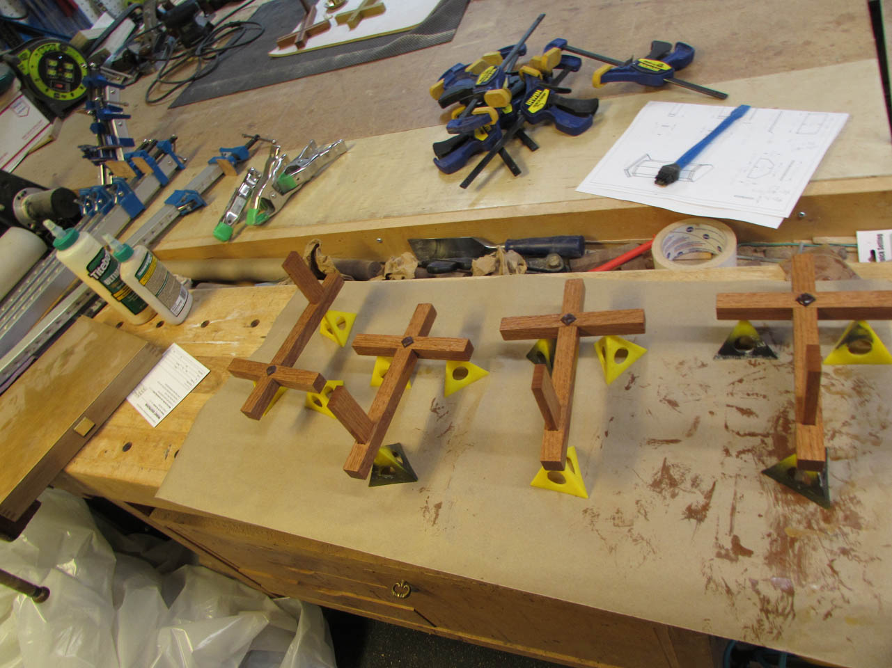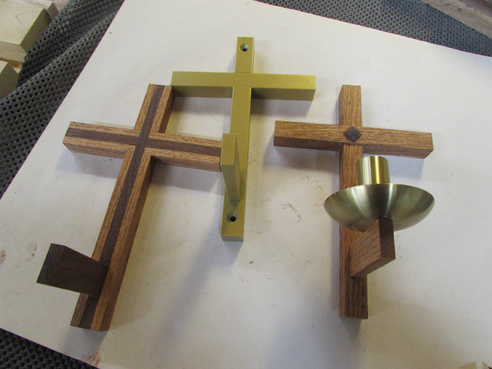 Monseigneur Rowan had one last request before I drove up to deliver all of the chapel furniture. He purchased four wall hanging candle holders but they arrived as painted metal, not the wood displayed in the picture. He requested that I replace the crosses with ones that matched. The gold one in the picture below is the original, The two on either side were two of the options I presented him. I also made one that was just oak, but we felt that there should be an element of walnut to tie it back to the other furniture, so the diamond was added at the center of the cross. The simple one was chosen So I made three more.