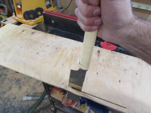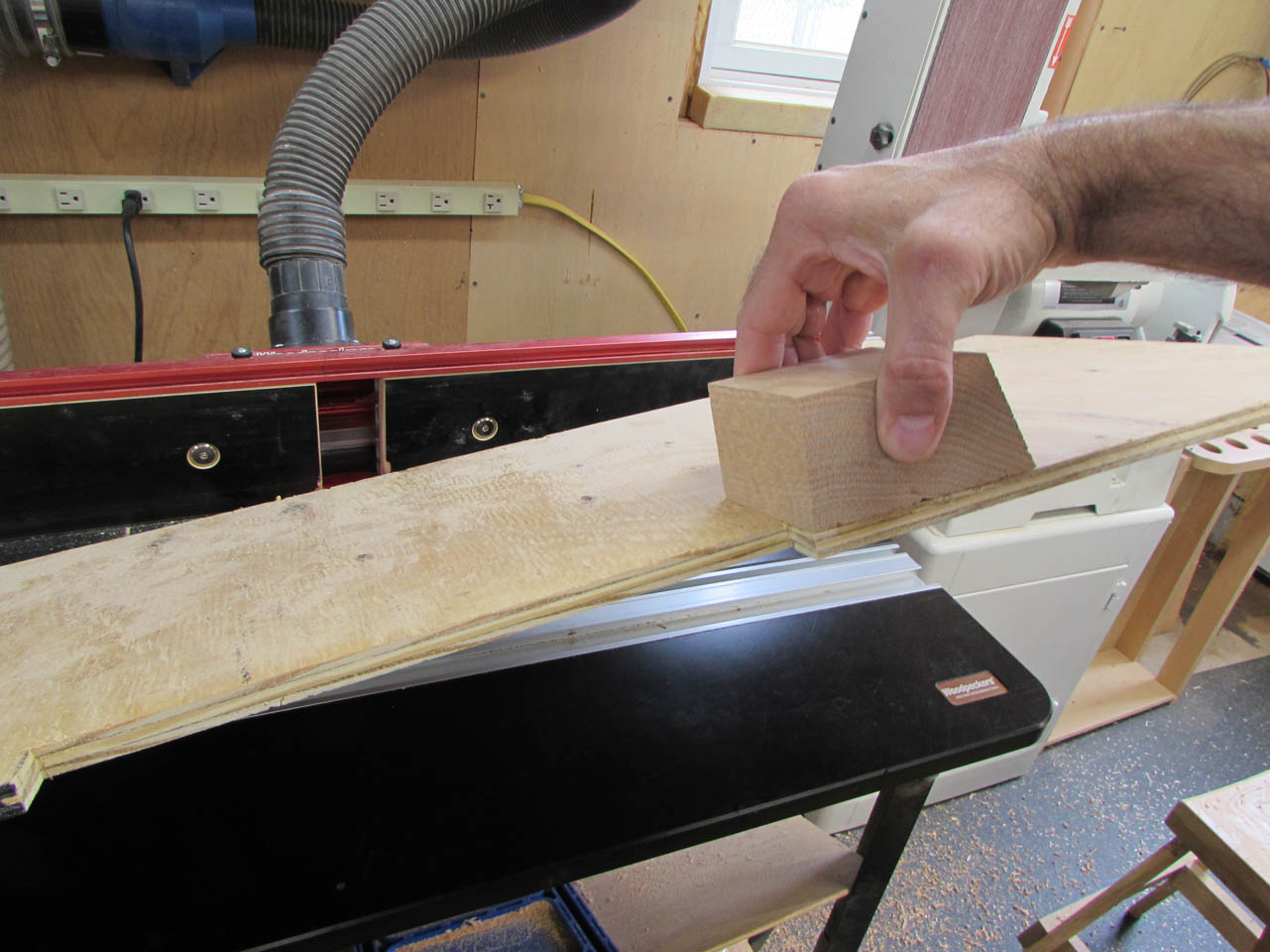 I carefully hold the right side of the wood strip while lowering the left side onto the spinning bit.