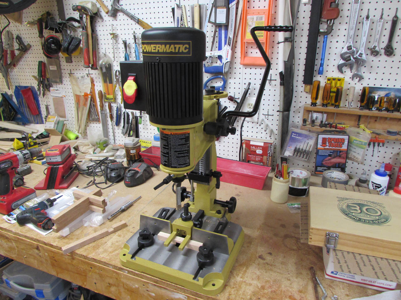 Time to introduce my newest tool in the shop. This is the Powermatic PM701 Bench Mortiser. For the last couple of months, Powermatic was running a 15% off sale with free shipping. I thought this might be a useful addition to the shop. The mortiser drills holes and the drill bit is housed in a square chisel which cuts square sides to the hole as you drill.