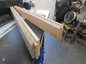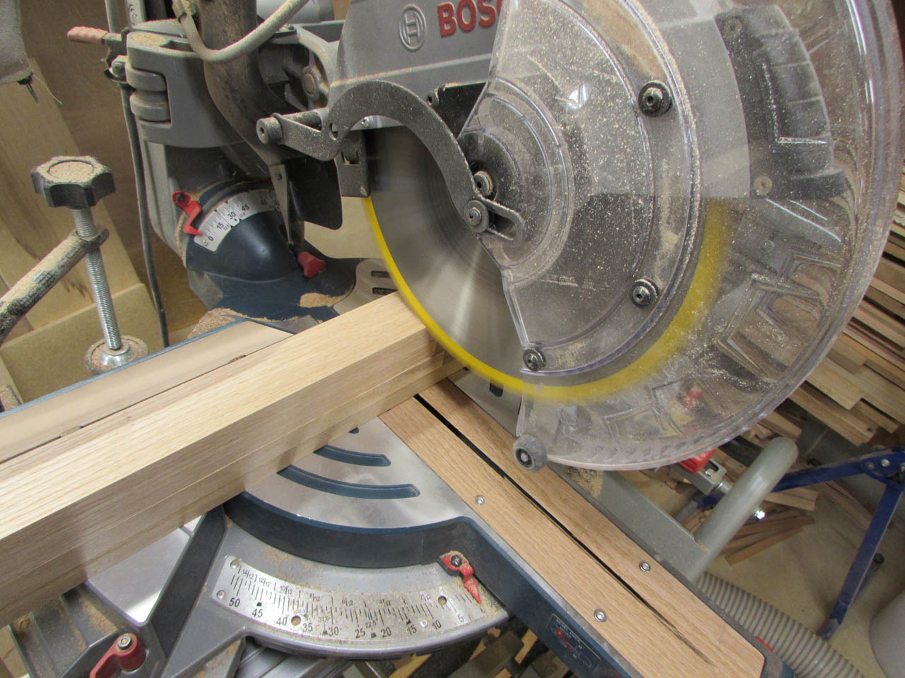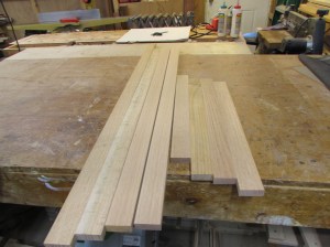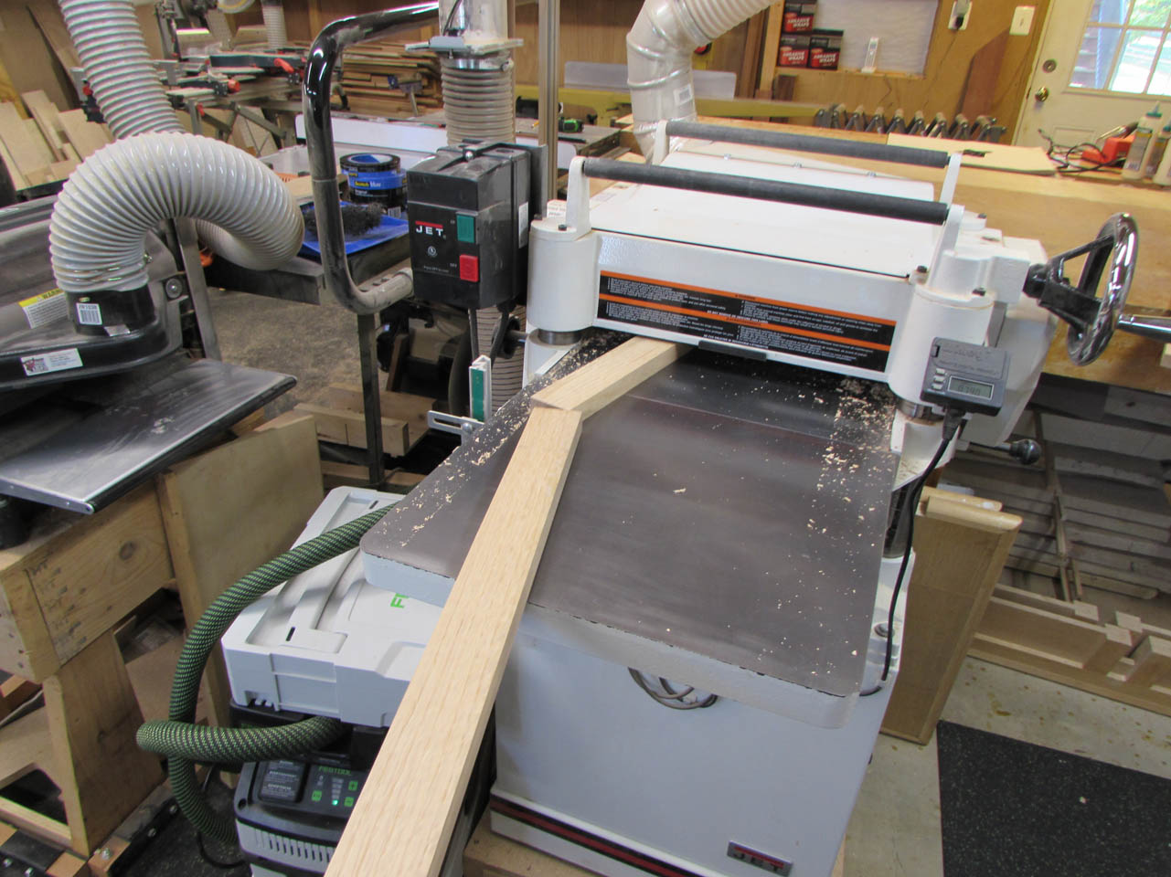 I have a lot of oak off-cuts from the last project, so I rough-cut them to length and started flattening them on the jointer.