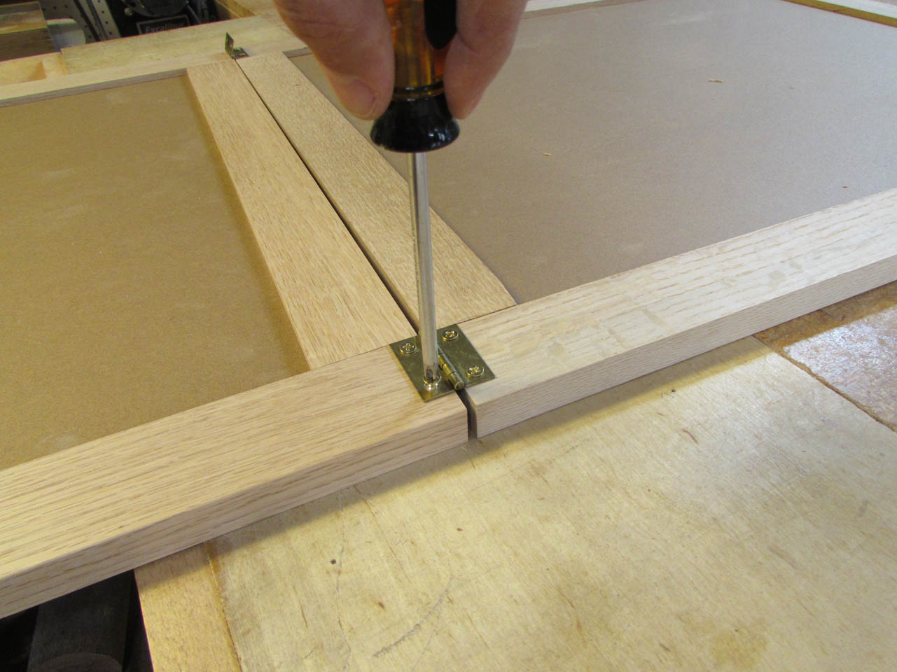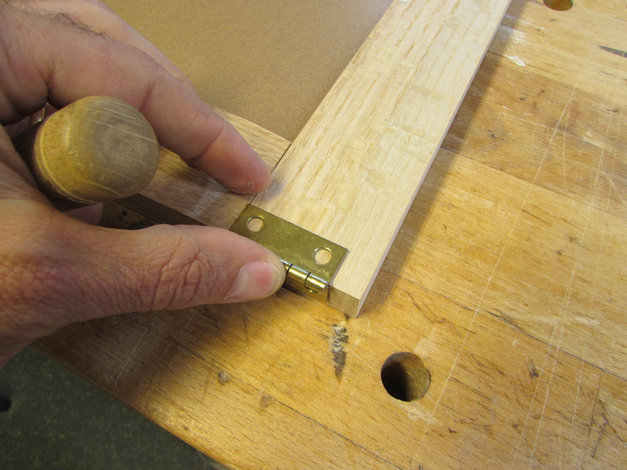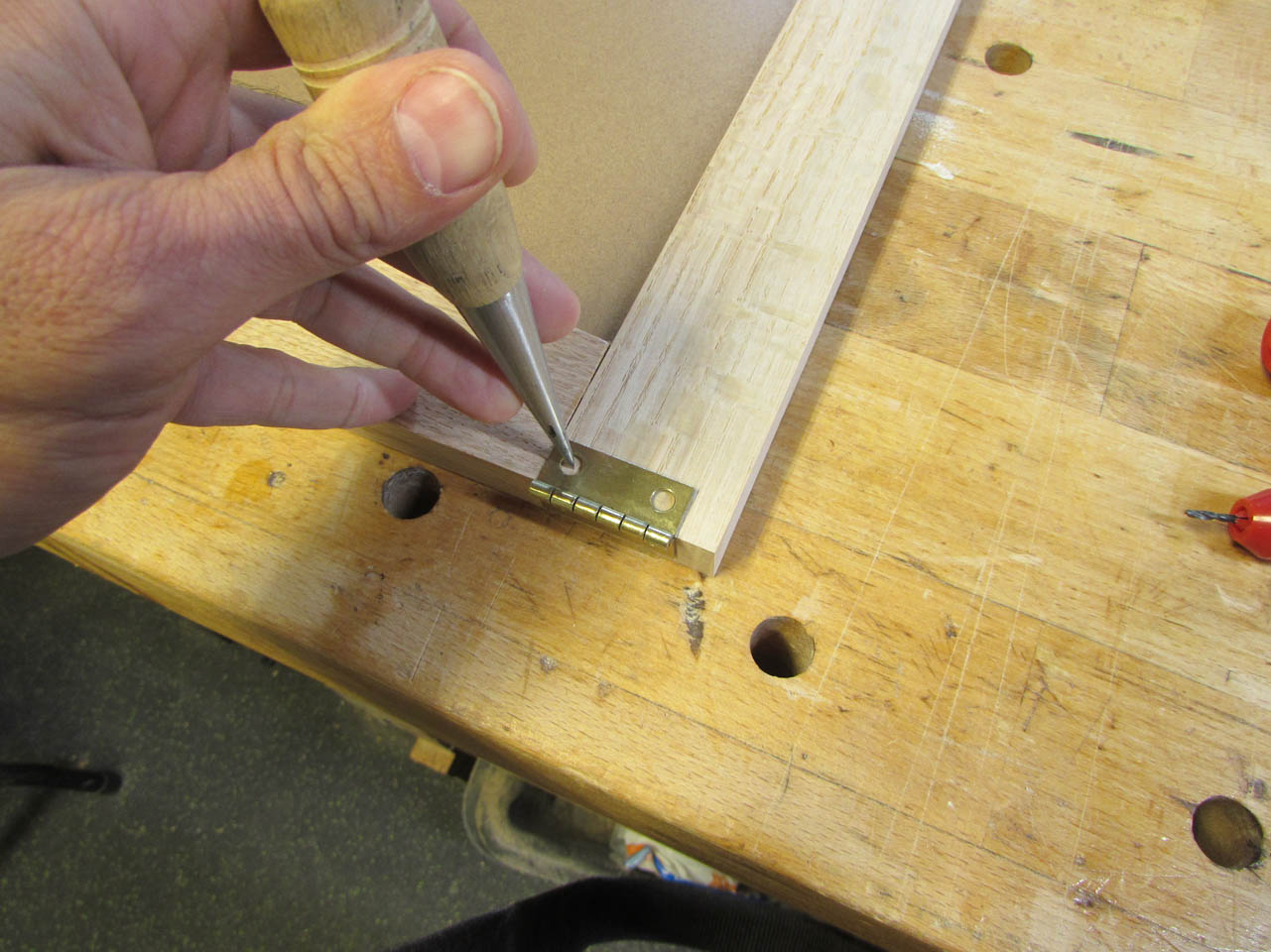 When both frames were dry, I located the hinges at the top and used an awl to punch a center point for the screws.