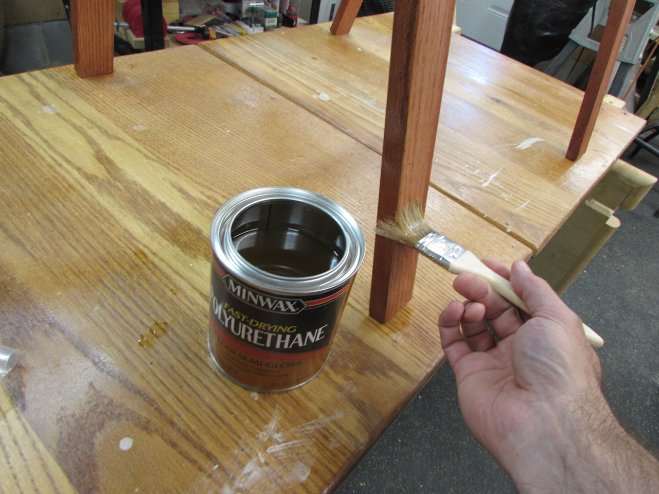 The next day, when the stain was dry, I started applying the polyurethane. I did not feel like disassembling everything, so I started in the hard-to-reach places first and worked my way down.