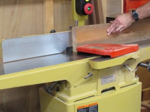 I flatten the face of the board on the jointer, then rotate it 90° and joint one edge to make it dead flat as well.