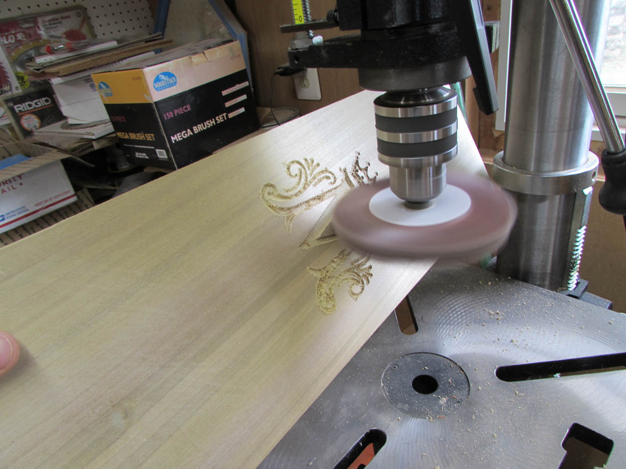 Meanwhile, the carve of the first side of the cross finished. Soft wood is always a bit fuzzy when routed. I placed my mop sander into the drill press and spun it up to about 2,000 rpms to sand off the fuzzys.
