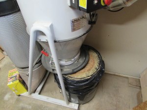 While that is drying, I pulled the cross off the CNC and sanded the second side, then set it aside to work on later. I also noticed that the dust collector was full after a couple days of planing down boards. Time to empty that…