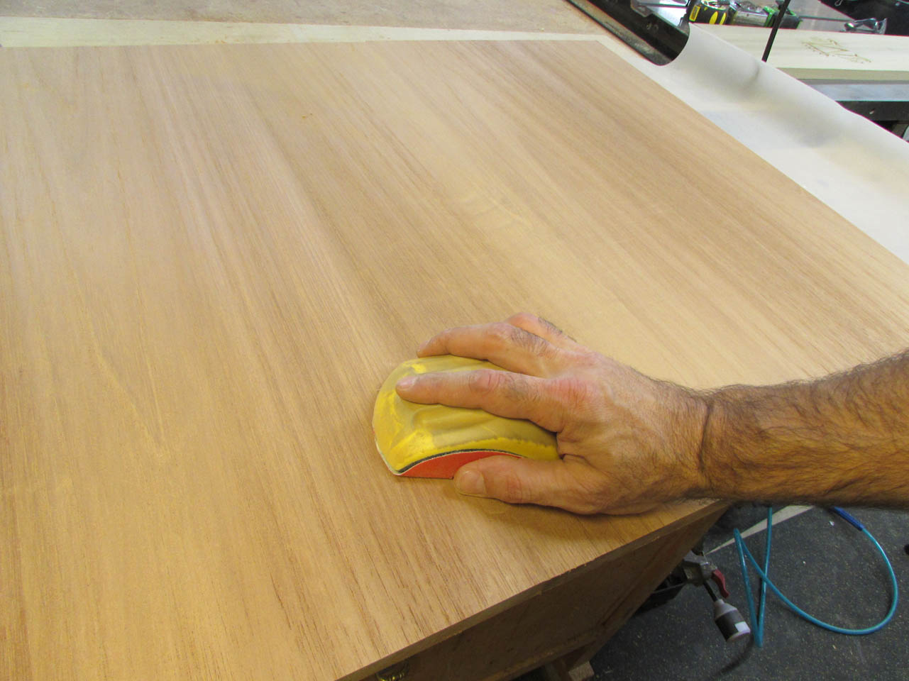 When the glue was dry enough, on my panel, I used a wide chisel to clean up the glue squeeze out, then hand sanded the face.