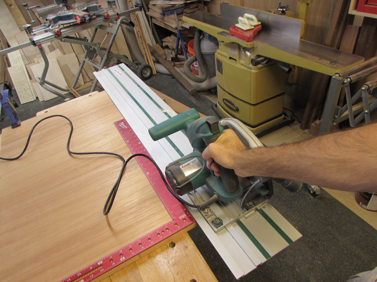 All of the boards were cut longer than the 27″ I need, so it is time to cut one edge straight. To do this, I clamped on a track for my track saw, and used a square to make sure the edge was 90° from the edge.