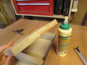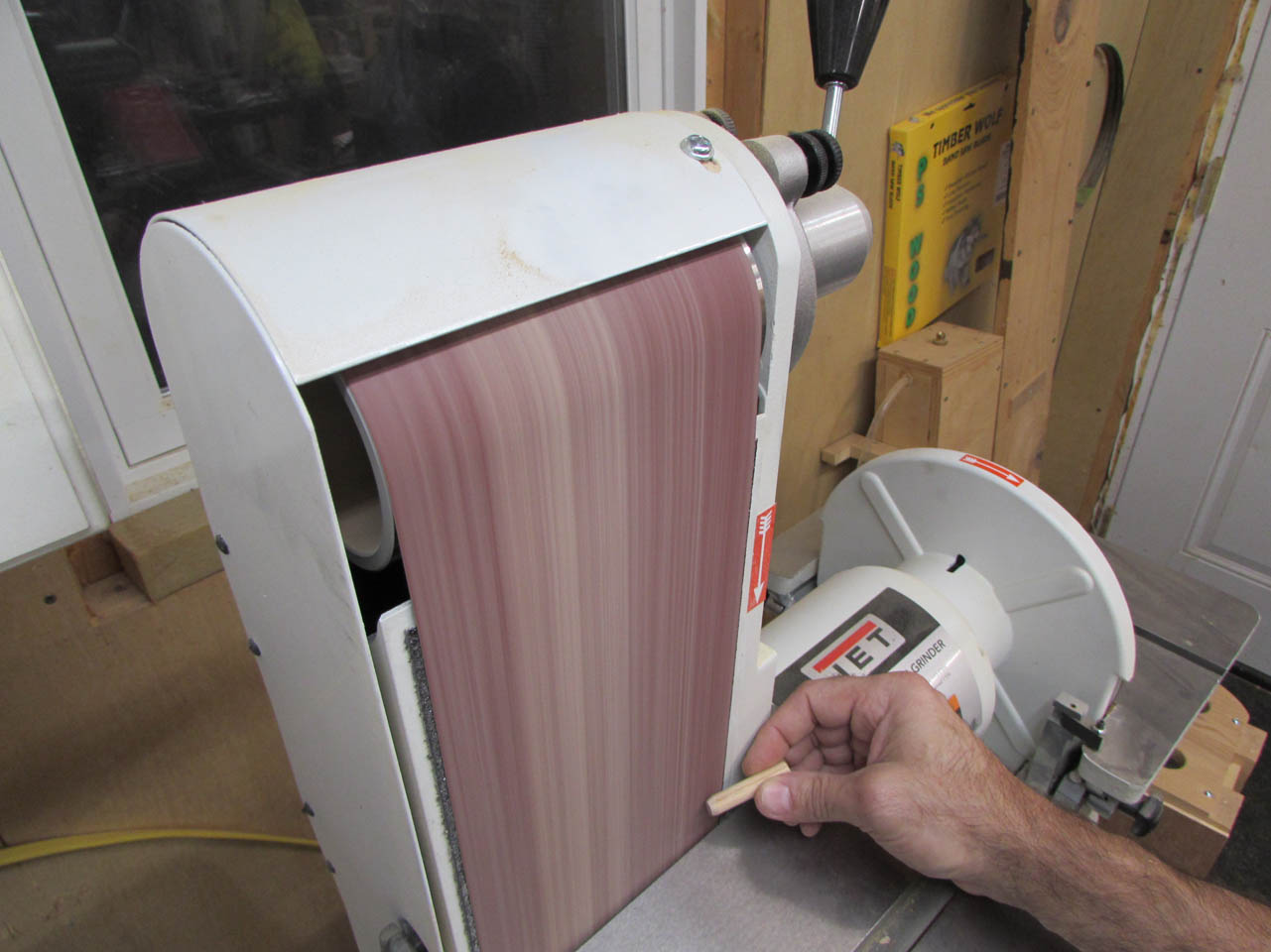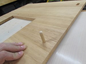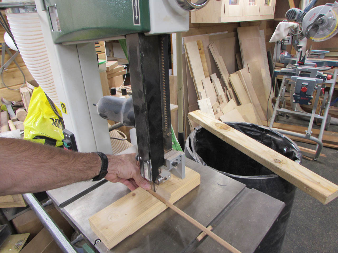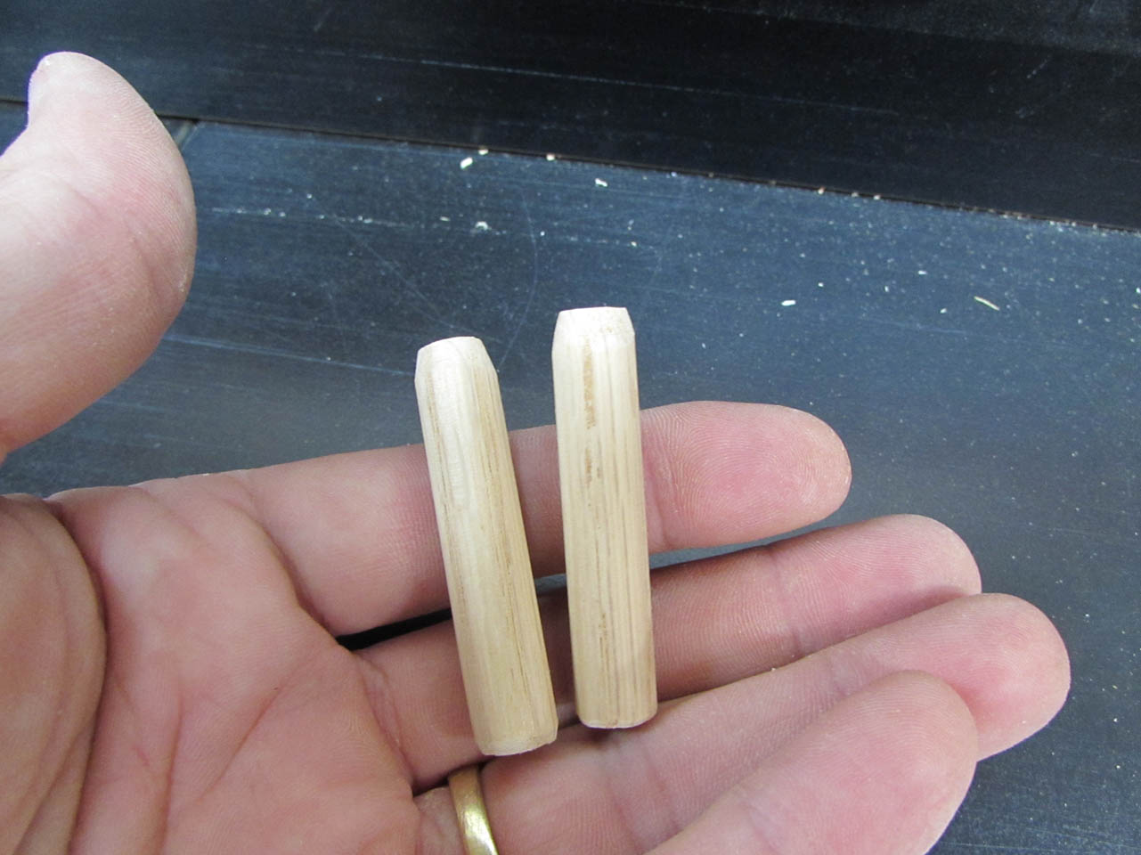 Once drilled, I set the dowel in the hole and marked the depth, then marked 1-1/4″ higher up to give me a cut-off line. I like to cut small dowels with a v-block, on the band saw. My fingers have to be way too close to use a miter saw.