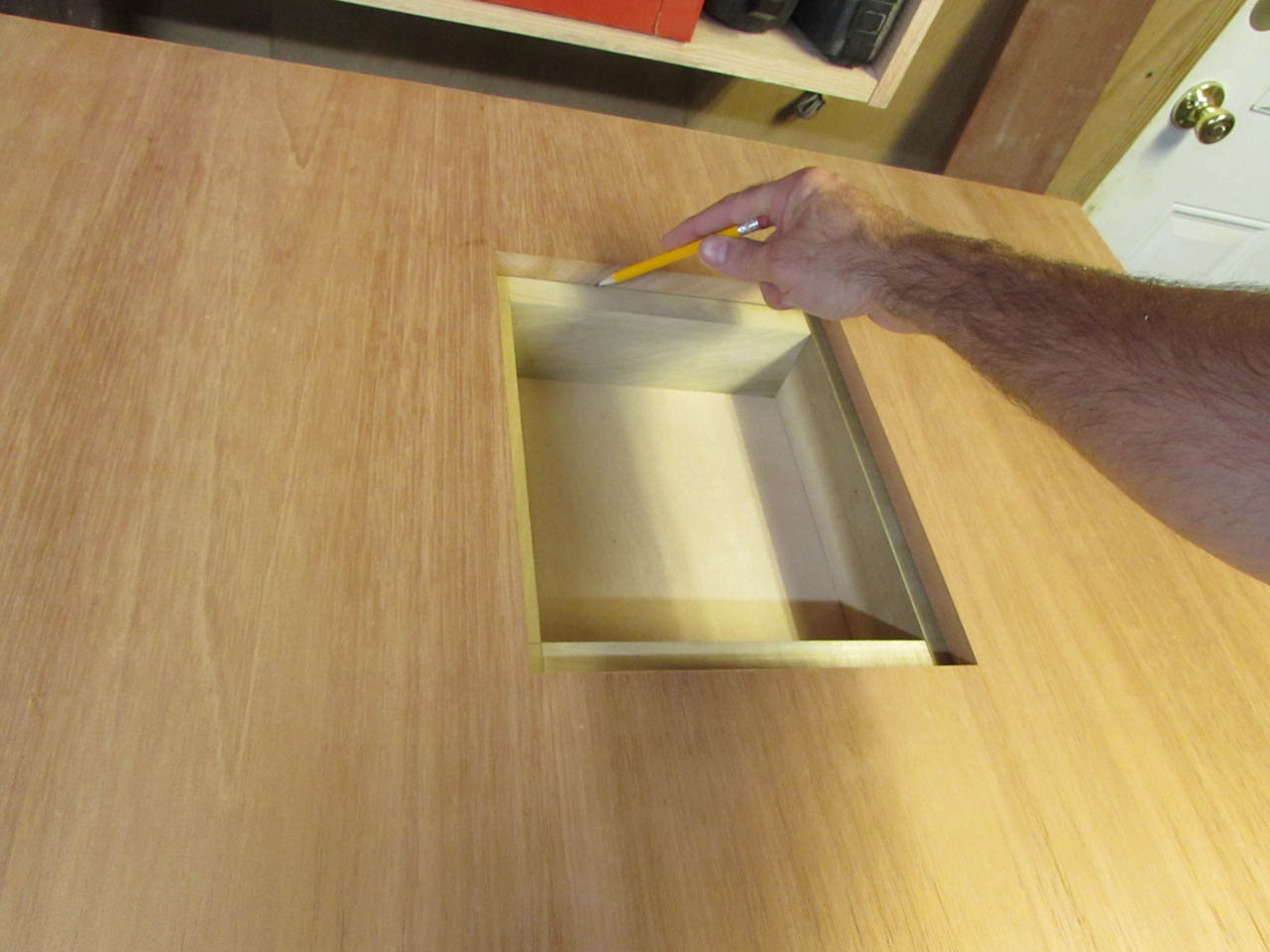 I used a compass to clearly mark the circle I needed to cut, then used a board to mark the straight lines from the saw cut to the circle.