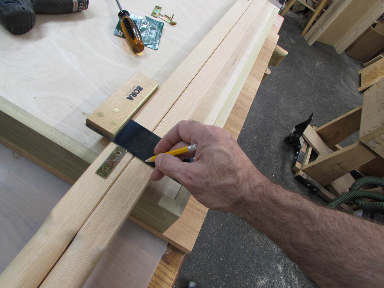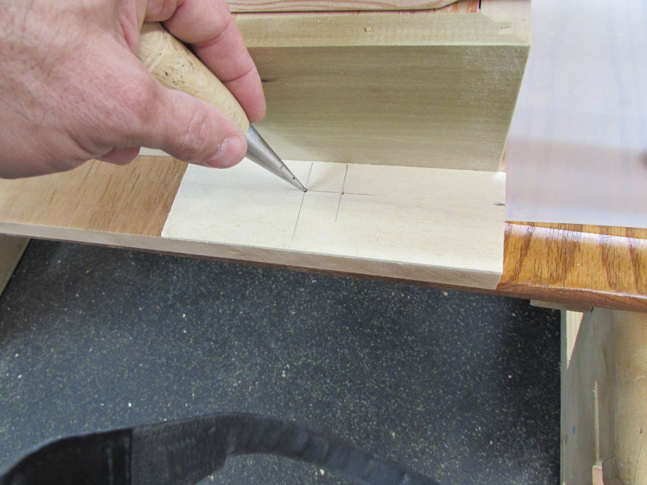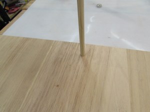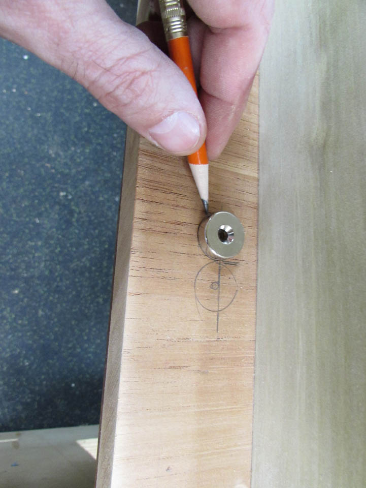 I laid out the first corner of the top with the magnet location, then had a better idea. I grabbed a thin piece of wood and made a template. Then I just held it in each corner and used an awl to punch center points for the drill.