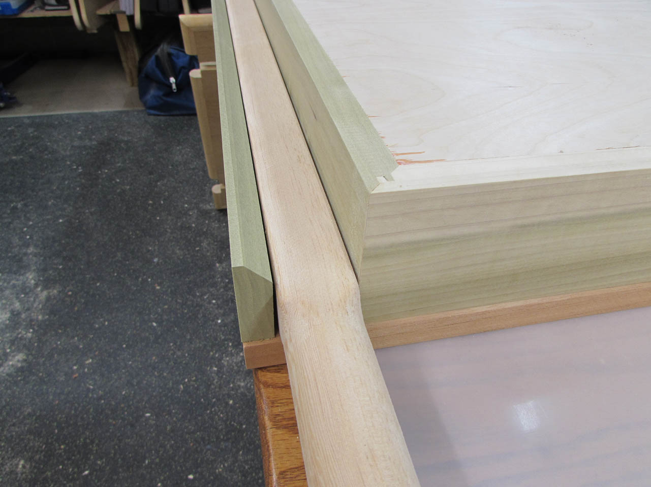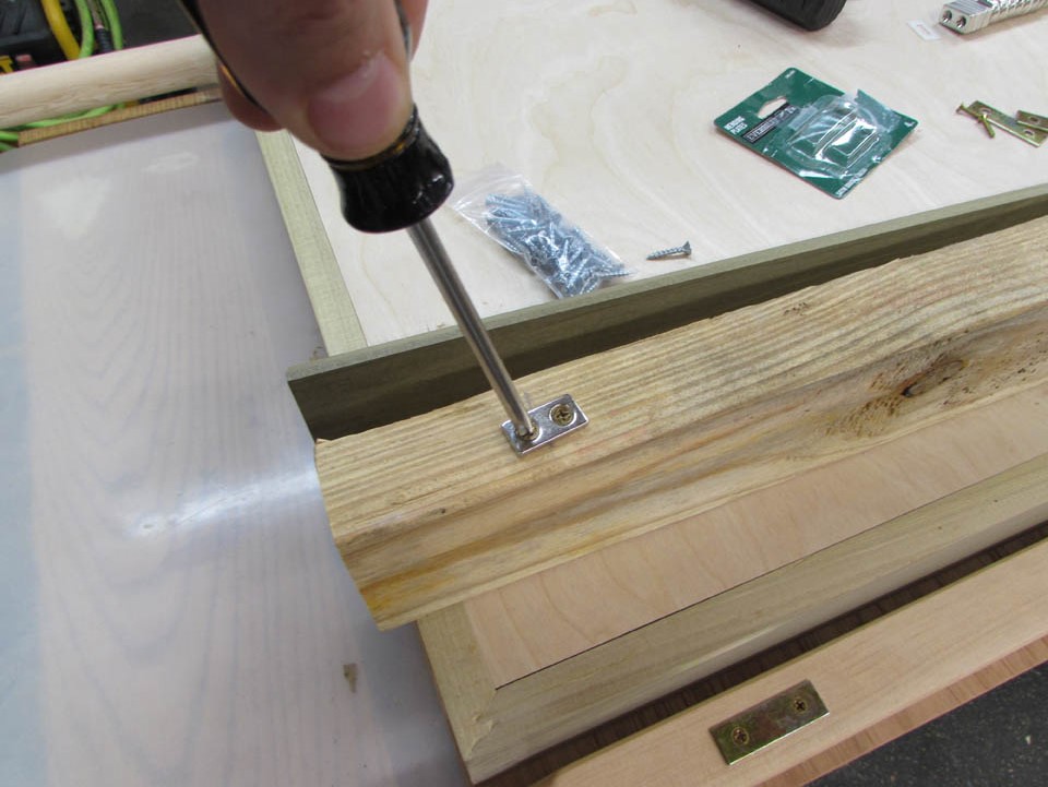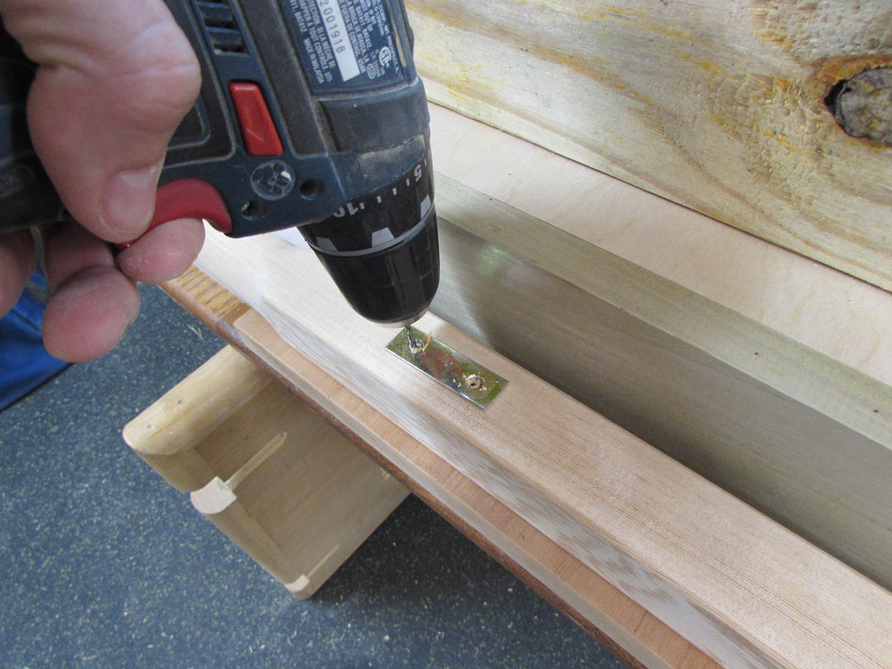 I laid out the first corner of the top with the magnet location, then had a better idea. I grabbed a thin piece of wood and made a template. Then I just held it in each corner and used an awl to punch center points for the drill.