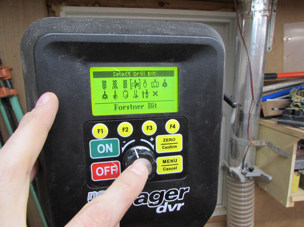Have I mentioned that I got a new drill press yet? My Steel City died and the company went out of business so spare parts are not available. This baby has a brain! Fit and finish is not great on the cast parts, but the computer and motor are awesome. You can tell it what bit you are using, the type of material you want to drill, and it will select a speed that is appropriate. I didn’t trust it at first because I always used the slowest speed on the old drill press, but I tried what it suggested, and I got no tear-out what so ever. For most drilling operations (in wood), it recommends 1,200 – 2,500 rpms. I always thought that was too fast but I was wrong.