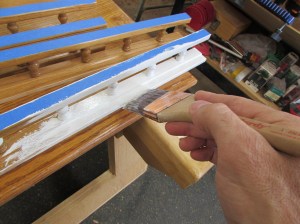 I need to do a lot of pre-finishing before I can start assembling anything. I start by painting the rails. I am using a good quality exterior paint and applying it with a brush to reach all of the tiny details around the spindles.