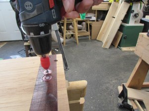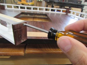 When the glue had set, I pulled the clamps and flipped the top over. I cleaned the epoxy out of the counter-sunk magnets and drilled pilot holes for screws. I used 1″ long wood screws that sat flush with the face of the magnet when installed. The screws are just long enough to enter the base of the rails above but not pass through. This is a good backup to the epoxy. I don’t want the magnets to ever pull out and stay stuck to the poles by accident.