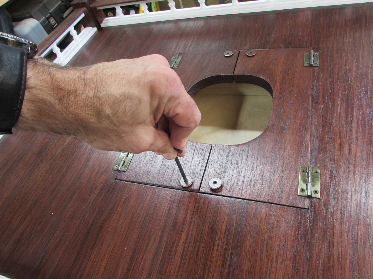 Before I can attach the top to the base, I need to re-install the doors that hold the statue base. I have to make sure the bolt holes line up correctly with the inserts.