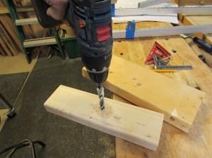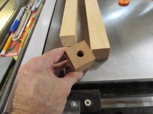 I need to drill a 1/2″ diameter hole straight up through the bottom, center of each post. I made an extra block when I was making the corner posts. I thought it would make a useful drill guide so I cut it down to the same dimensions as the posts.