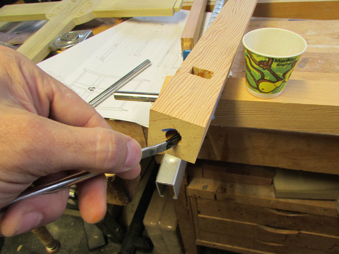 With the steel posts inserted, I could easily deal with squeeze-out because it all welled up in the mortises that broke through to the post holes.