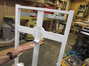 To paint all sides, at the same time, I had to figure out a way for all of the wood to be exposed at once. The steel posts were the answer. I drilled a 1/2″ hole into two scrap blocks and inserted the posts. Now the back has feet.