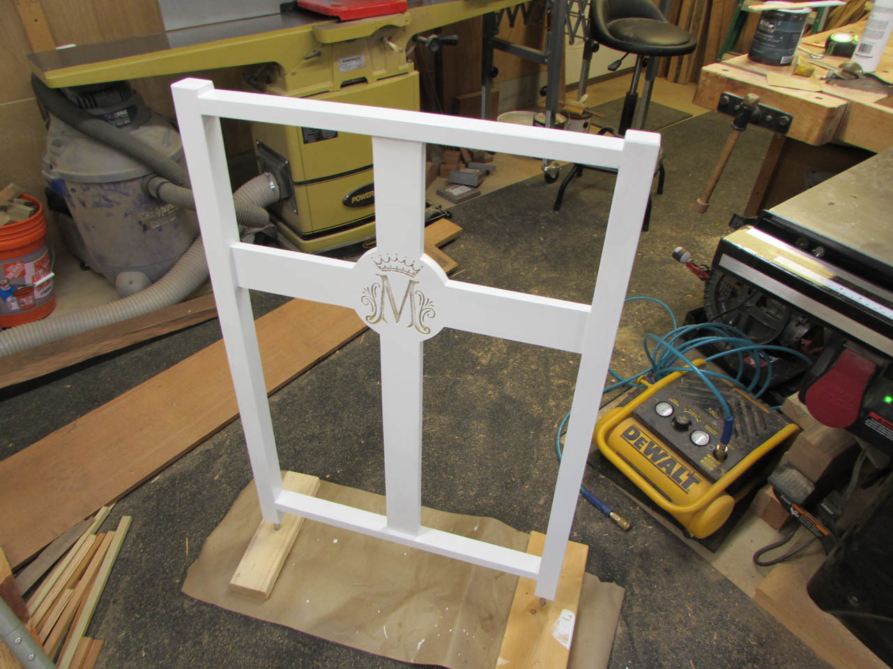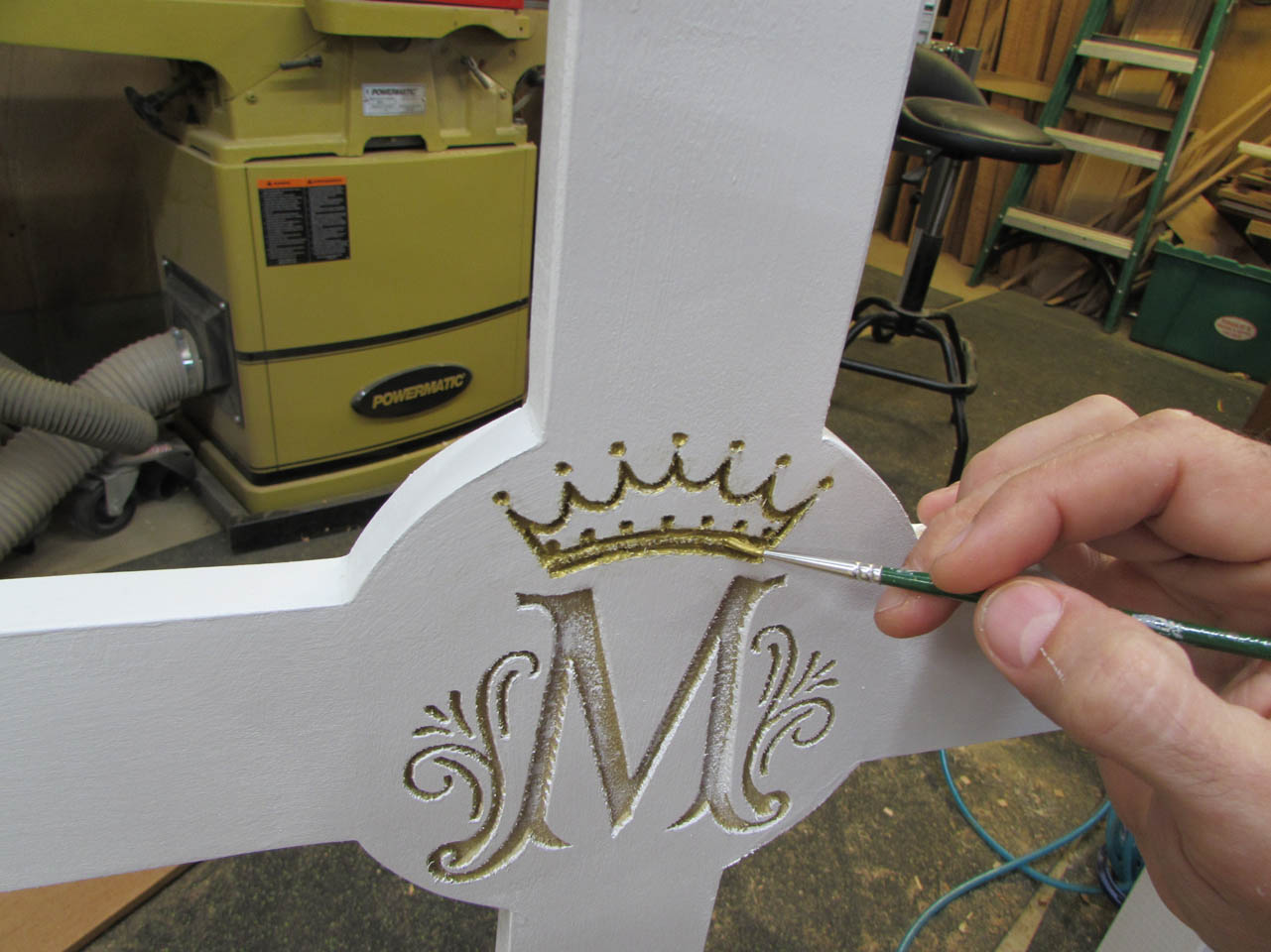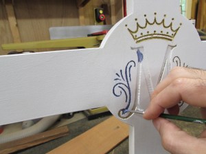 Once the paint had set, it was time to start on the Marian symbol. I am picking out the crown in gold and the “M” in blue.