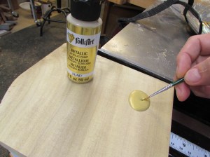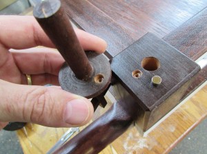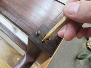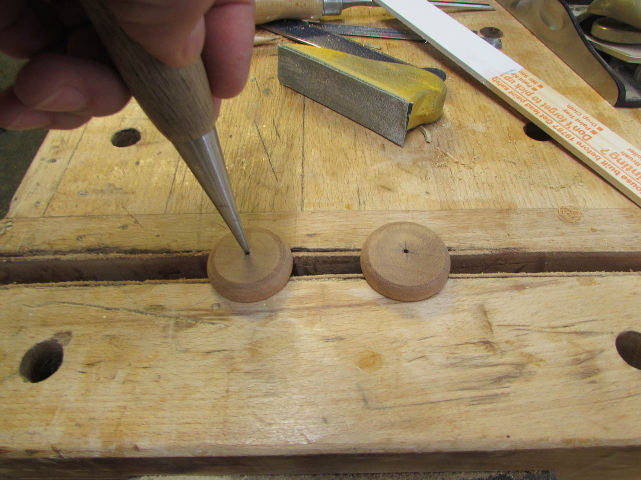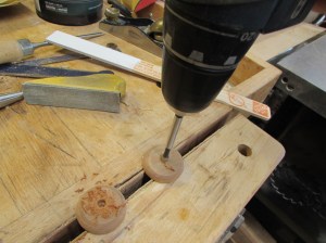 After placing a pilot hole with an awl, I drilled some 1/4″ holes, about 1/4″ deep.