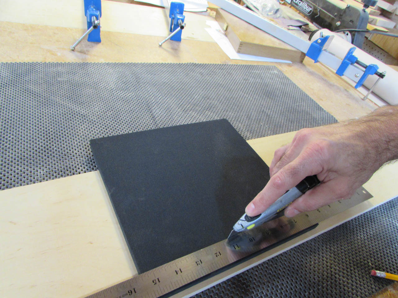 The next thing to do is line the socket with dense foam. I have some 3/8″ thick stuff that I bought online. I trim it with a razor knife and a straight-edge.