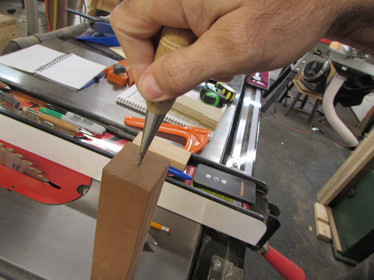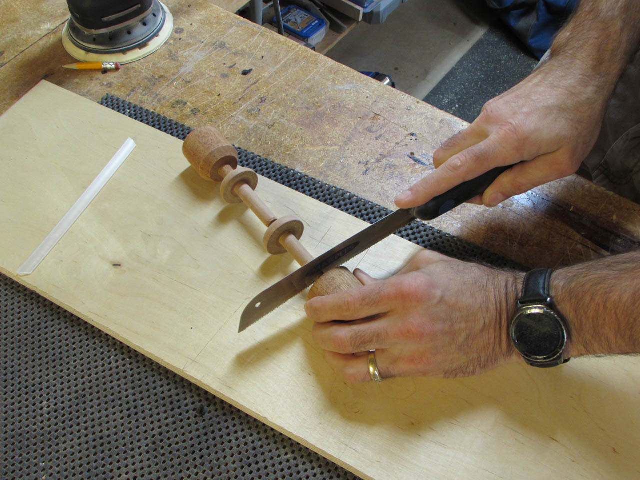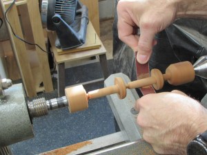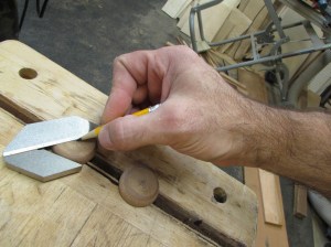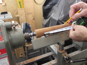 After I marked out the location of the two bases and a 2″ long post below, I started cutting the rest of the spindle down to size.