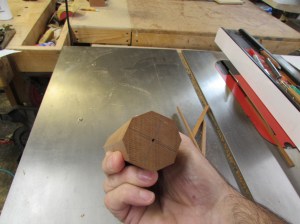 I marked the centers while it was still square, then set my table saw blade to a 45° angle and cut off the corners.