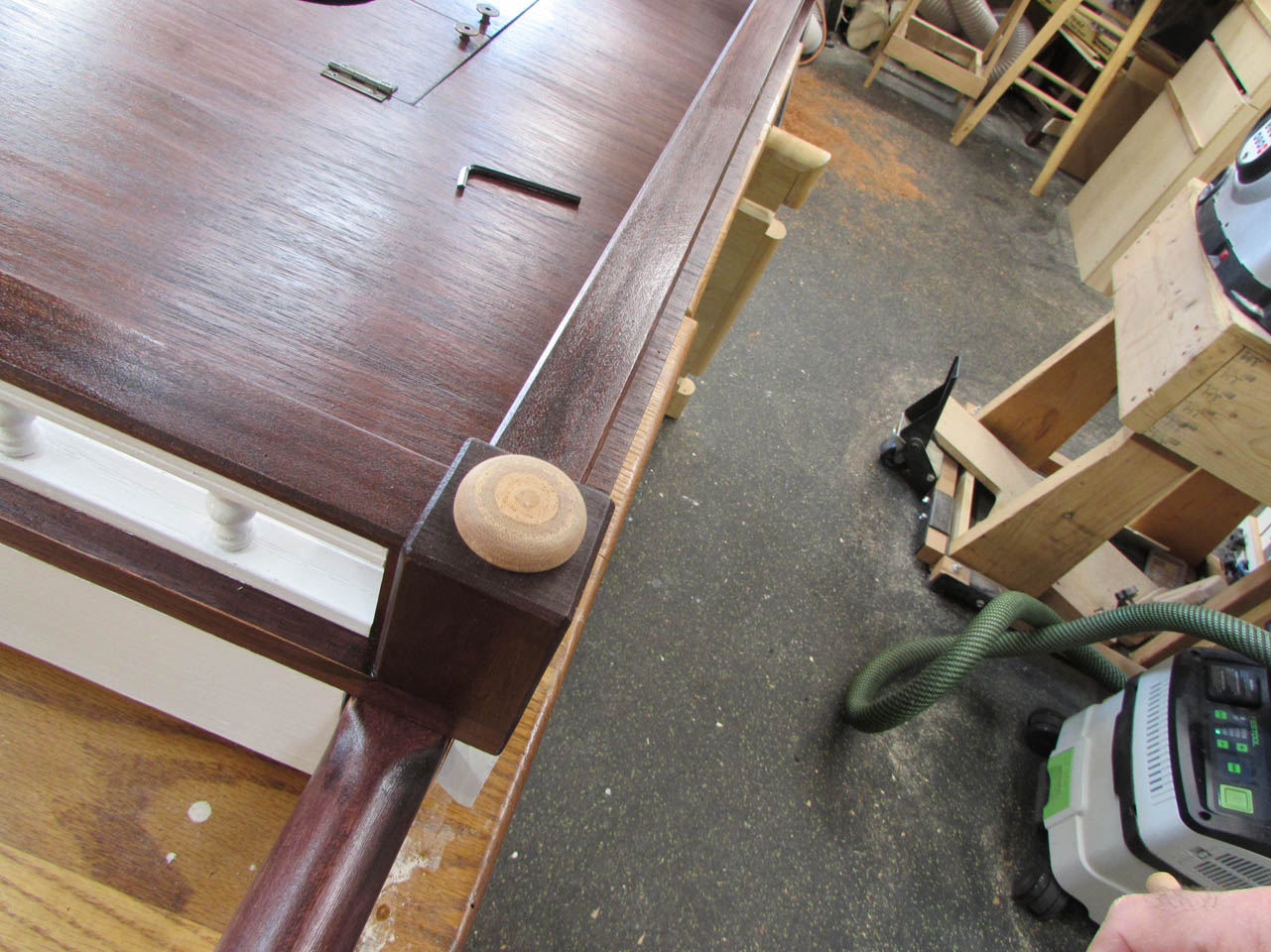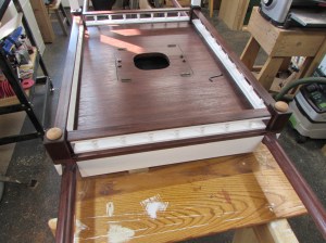 I turned the posts, below the bases, to just below 1/2″ in diameter. This will slip into the hole in the corner posts.