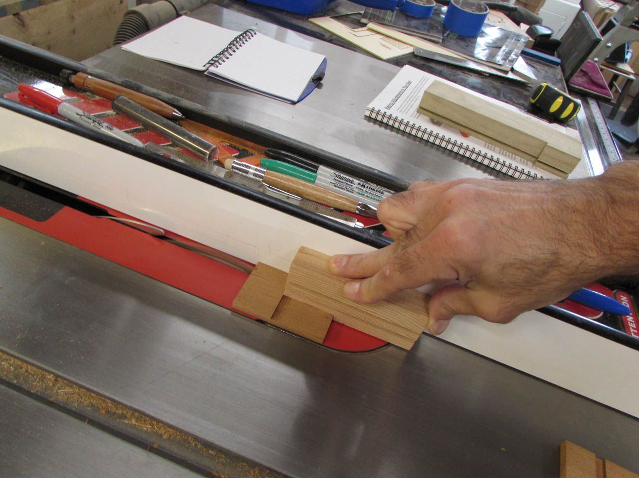 I used a very small push block to safely cut the groove as well as the final dimensions of the pieces.