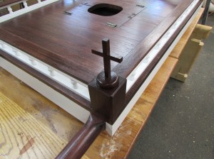 With the foam done, the last thing to do is make the two small crosses that will sit on the front corner posts. To do this, I cut down a 1-3/4″ square chunk of sapele to turn the bases.