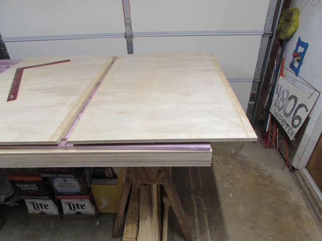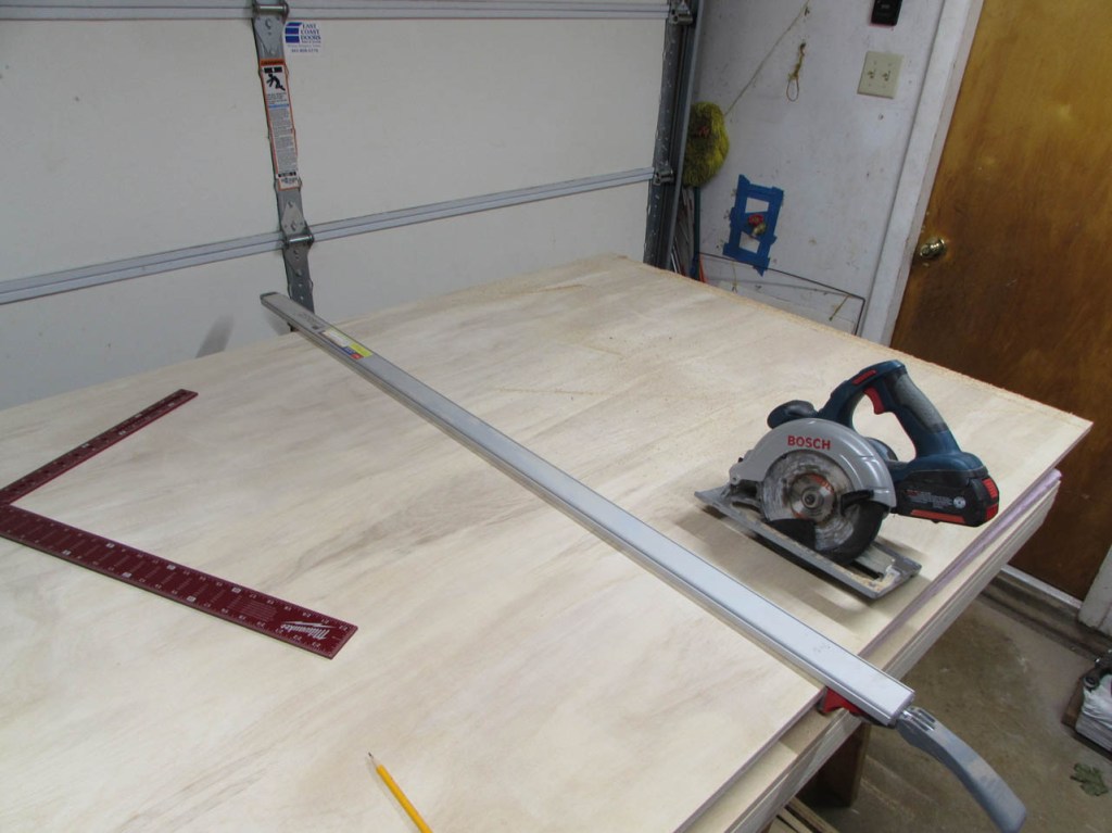 I started by cutting two sheets of plywood down to 32″ lengths with a straight edge and a circular saw.