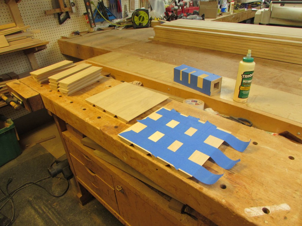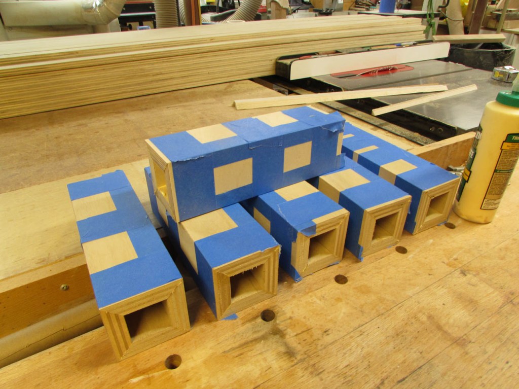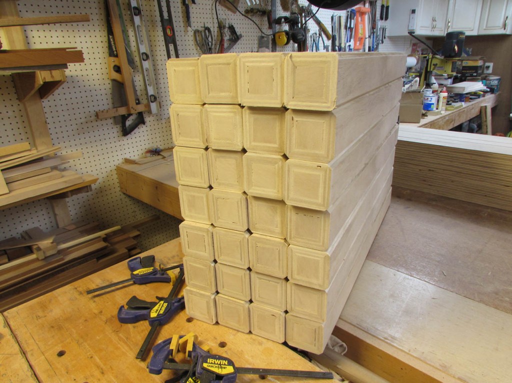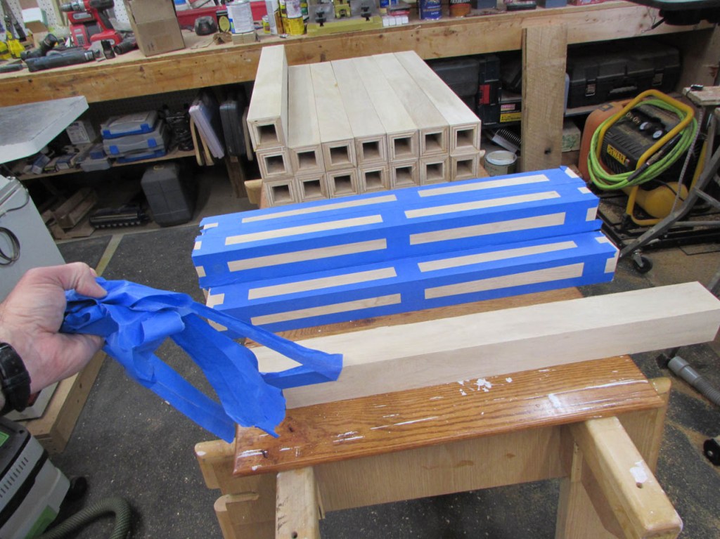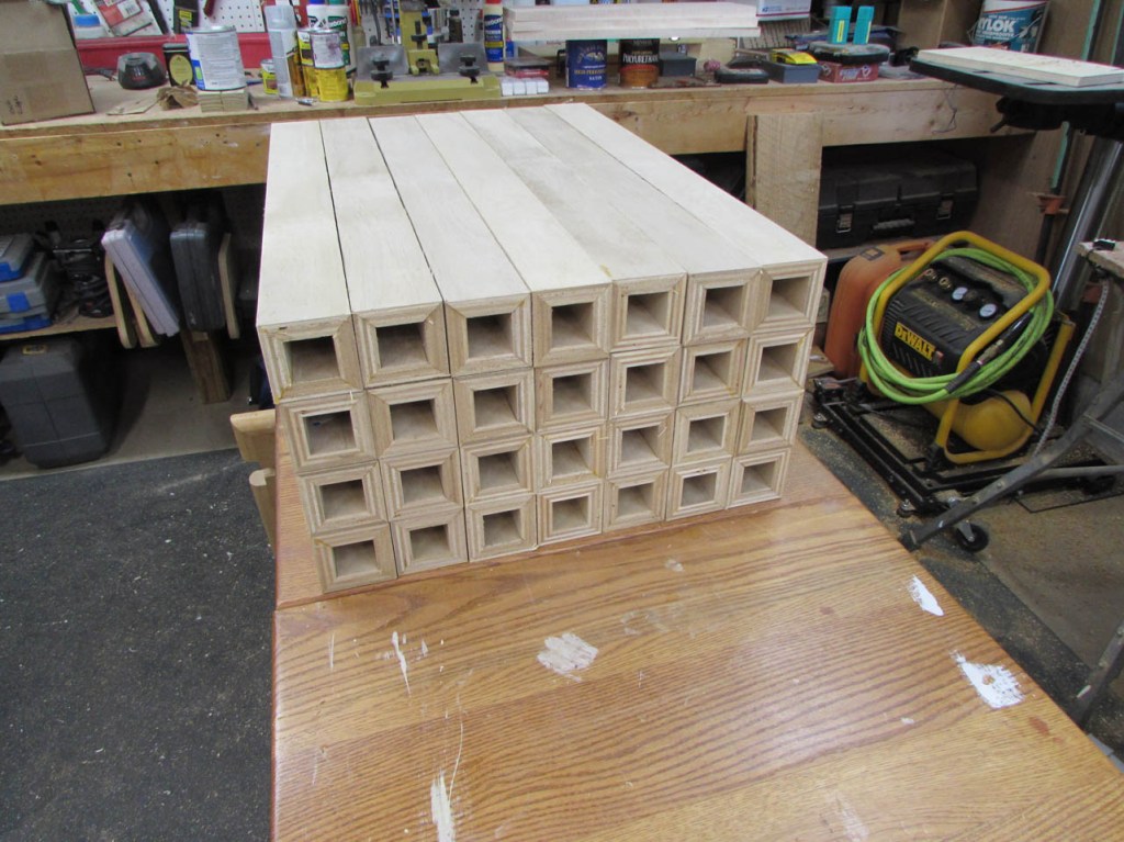I will leave the final sanding, of the rest of them, for Chris. I spent some time working on the structure under the tables and the layout of the legs and determined that I was one leg short and I needed some short legs for support, above the hearth. So I went back to the table saw and the scrap pile and pulled together the rest of the leg parts.