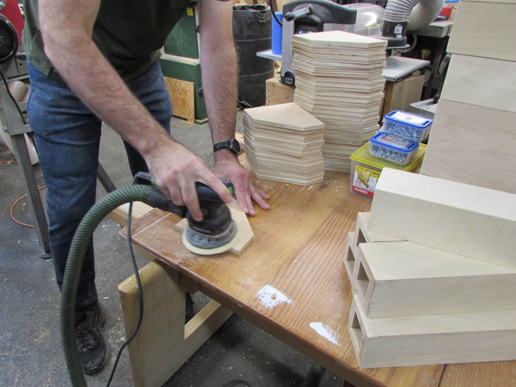 My wife stopped by to help again so I set her on beveling all of the legs while I sanded all of the gussets.