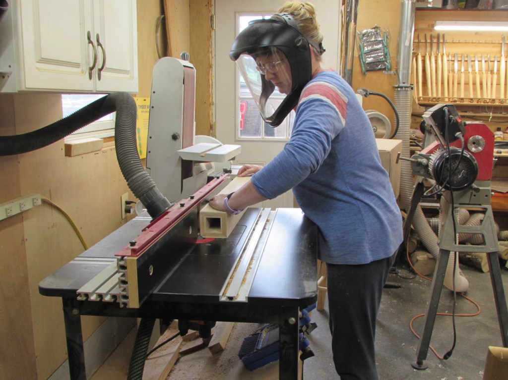 Since Chris’ children will likely be building forts below the train tables, we decided to apply a beveled edge to the corners so nobody banged their heads into anything sharp. To do this, I put a 45° chamfer bit into the router table and ran each corner of the leg across it.