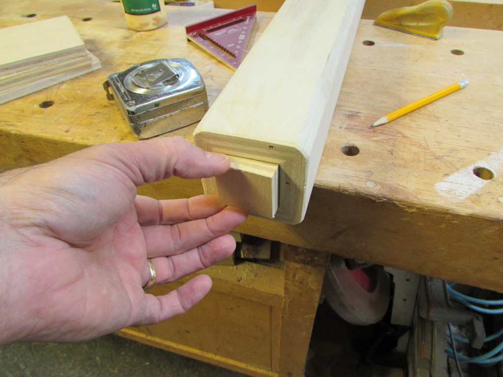 I clamped a stop in place to repeat the 45° cut for each gusset. We could have left the square point, but little kids would bang their heads into them. Also, they wouldn’t look as nice…
