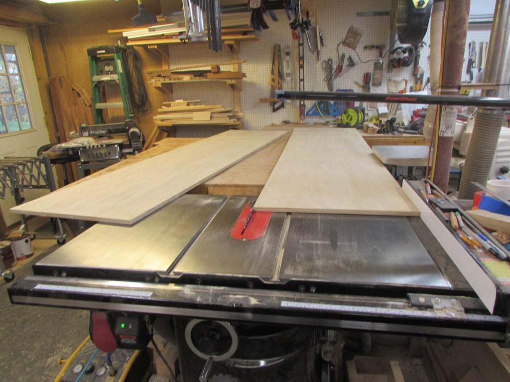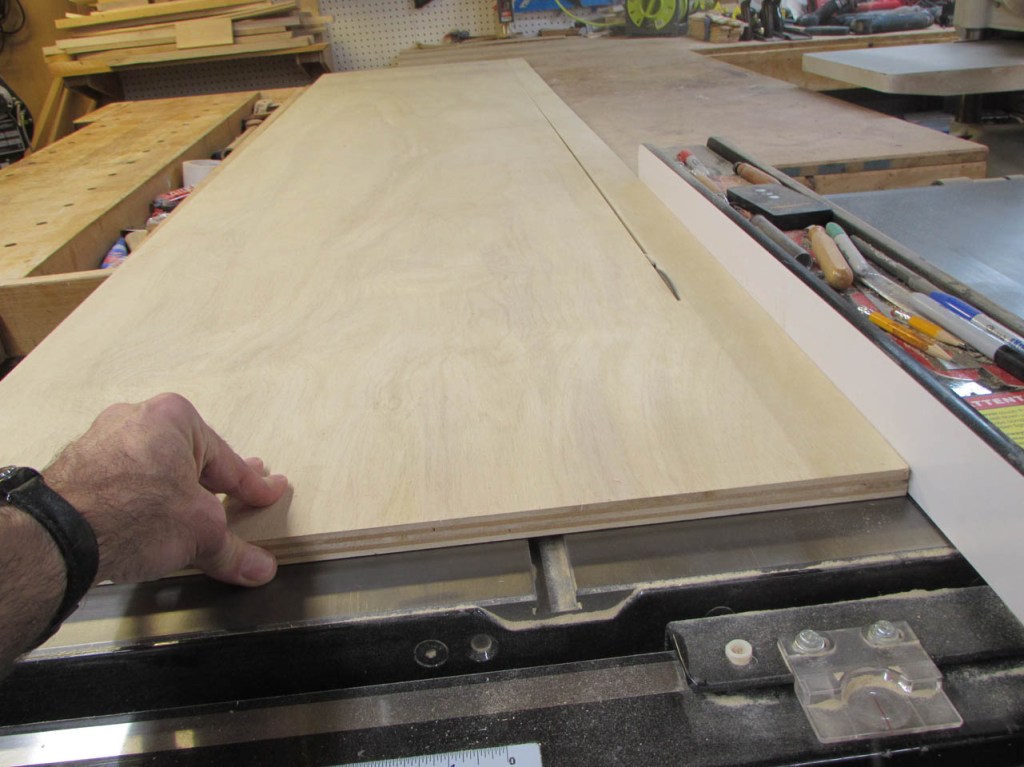 To create the under structure of the tables I am ripping 3/4″ finished plywood down to 2-1/4″ wide strips. Since the sheets are so heavy, I start by ripping them in half.