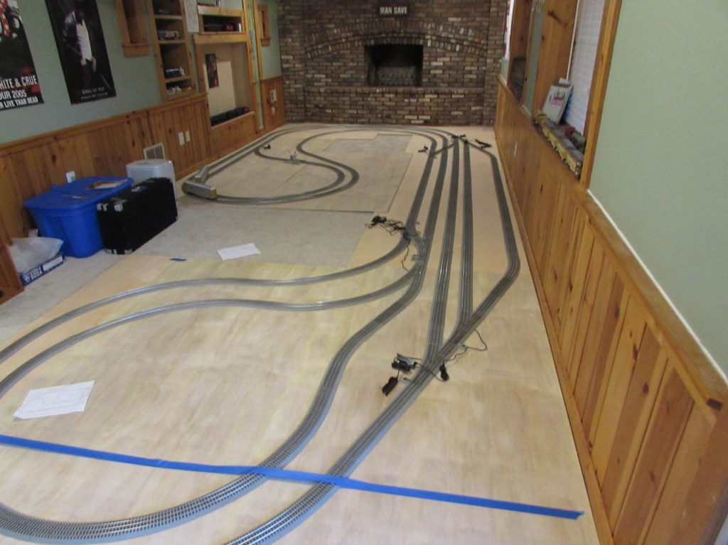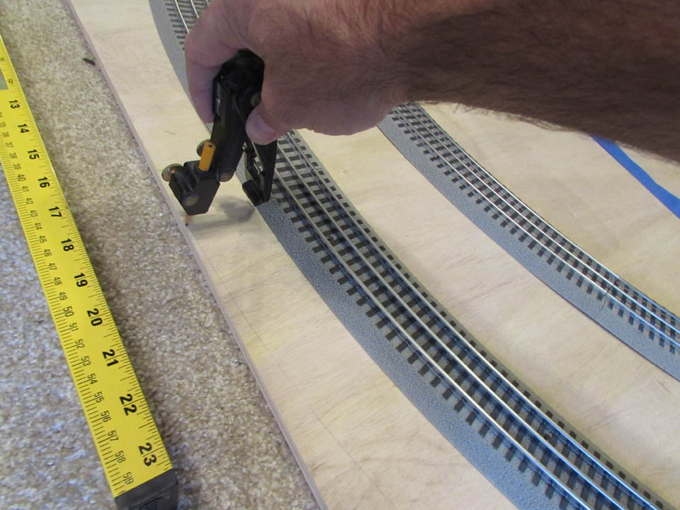 Chris has finished making his adjustments to the track layout. He even managed to add 10″ to the length of the shorter loop. Before I move anything, I need to mark the outer edge of the train table. This dimension is determined by the one of Chris’ trains that cantilevers out past the tracks the most, while going around curves. We cannot have the train hitting a wall or a person. After determining the dimensions required, I set my compass to the necessary width (about 1-1/2″), then scribe along the track where we want to cut away the excess. As you see in the picture above, if we did not cut some of it away, you would not be able to reach the far side of the tracks.