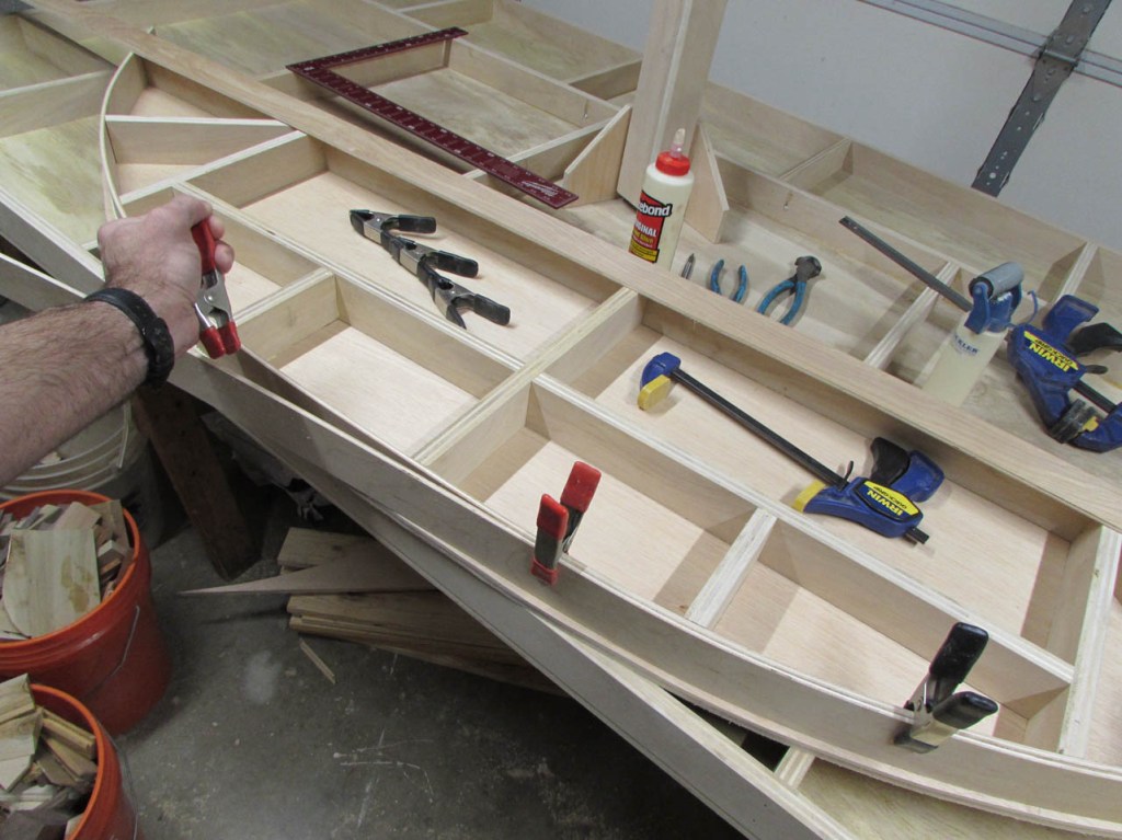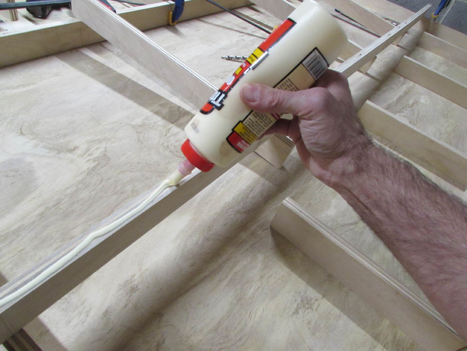I used a roller to coat the next strip of plywood and attached it to the first, using spring clamps along the curve and additional brad nails at the ribs.