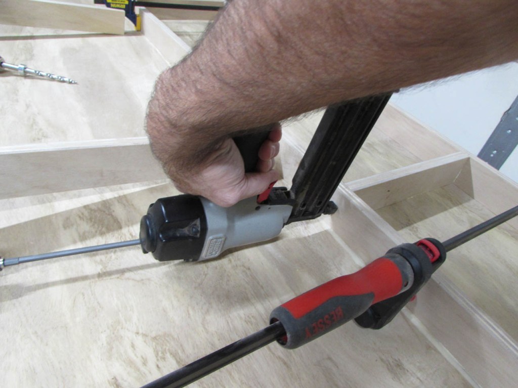 Instead of waiting for the glue to dry, I placed an 18 gauge brad nail every 6″ along the edge and removed the clamps.
